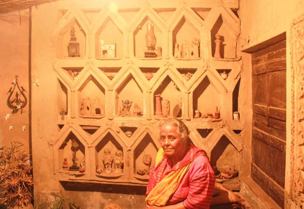 ছোট, কালো, বাহারি কাঠের দরজা– দরজার এ-পাশে পড়ন্ত বেলার উঠোন, কয়েকগুচ্ছ লতা আর গাছ। দরজা ঠেলে ভেতরে ঢুকলে টিমটিমে পৃথিবী। একটেরে মানুষের সৃজনশীল পৃথিবী। ইতিউতি ছড়িয়ে আছে একটা-দুটো আঁকা ছবি, ধুলো পড়ে যাওয়া সম্মাননা-মানপত্র, পেপারকাট পাপেট। রাজস্থান-গুজরাতের কুলুঙ্গি-নকশা বাঁ-হাতের দেওয়াল জুড়ে, সেখানে কোনও খোপে কাঠের পেঁচা, কোনও খোপে টেরাকোটার পুতুল, কোনও খোপে হ্যাজাক, কোনও খোপে কেরোসিনের লণ্ঠন। কুলুঙ্গির সামনে একফালি তক্তাপোশে কয়েকটা পরপর বই— কোনওটার বিষয় ফ্রিদা কাহলো, কোনওটা ভাল রাক্ষস, কোনওটা আবার ভোটের কার্টুন। ছায়াপুতুলের বর্ষীয়ান শিল্পী স্বপ্না সেনের মোকাম। স্বপ্না সেন রঘুনাথ গোস্বামীর পুতুলনাচ ঘরানার মনোযোগী ছাত্রী। আড্ডা শুরু হয় কুলুঙ্গির কথা বলতে বলতে, মরুদেশের সহজ মানুষজনের ঘর-গোছানোর গপ্প দিয়ে। শুনছেন সোহম দাস।