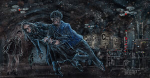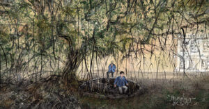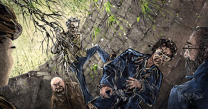 ‘বিলি গিলচারের হাতে বেমক্কা একটা ক্যারাটে-লাথি এসে লাগল বটে, তবে তা মারলেন অন্য এক ব্যক্তি। লাথিটা লাগবার আগে মুহূর্তের ভগ্নাংশের মধ্যে শোনা গেছিল এক সড়সড় শব্দ— সিঁড়িটার উলটোদিকে ঝুলে থাকা অশ্বত্থ গাছের লম্বা ঝুরি বেয়ে নেমে এসেছিলেন কেউ।’