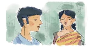 ‘দুপুরের ট্রেনে ফিরছিলাম, হাবড়া স্টেশন থেকে কলকল করতে করতে এক দঙ্গল কলেজ-ফেরতা ছেলেমেয়ে উঠল। তাকিয়ে দেখি, তাদের মধ্যে পেঁচোদার মেয়েটিও আছে। ভেতরে ঢুকতে গিয়েও আমাকে দেখে সে যেন ইচ্ছে করে গেটের কাছে চলে গেল।’
