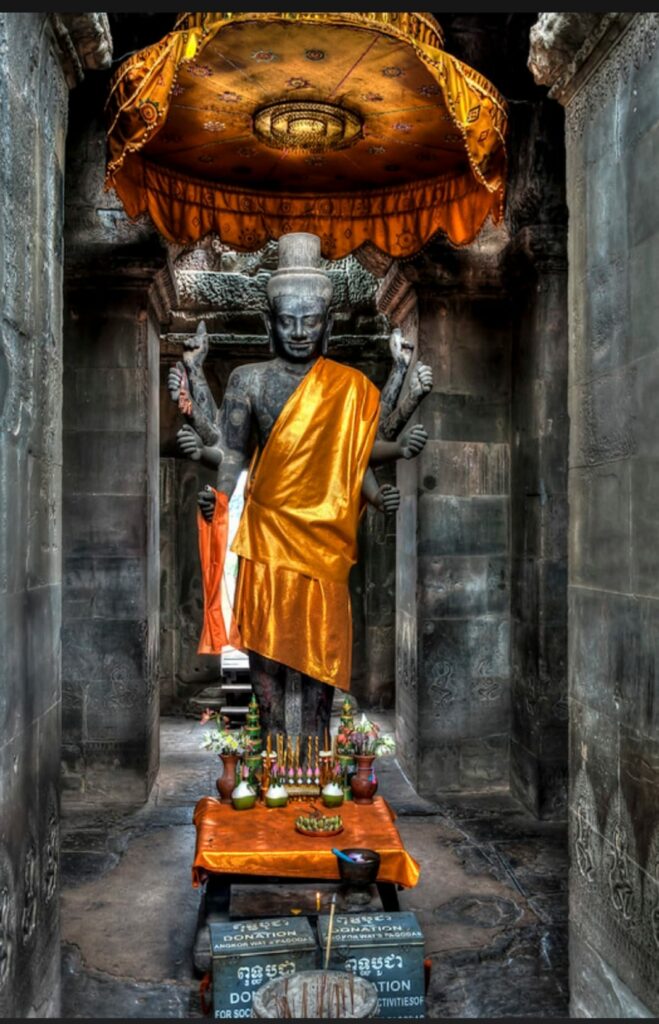 সেই কোন ছেলেবেলায় স্কুলের বইতে পড়েছিলাম সত্যেন্দ্রনাথ দত্তের কবিতা, ‘শ্যাম কম্বোজে ওঙ্কার ধাম মোদেরই প্রাচীন কীর্তি।’ পুরাণ আর ইতিহাসের সীমানা বেশির ভাগ সময়েই ধোঁয়াশায় ঢাকা থাকে। প্রাচীনকালে ভারতীয় ভূখণ্ড কম্বোজ কম্বু মুনির নাম থেকে এসেছে নাকি ১৮৬৩ সালে ফরাসিরা উপনিবেশ তৈরির পর কাম্পুচিয়াকে কম্বোজ উচ্চারণ করত বলে এই নাম, সেটা তর্কের বিষয়। যাই হোক, বাঙালি হিসেবে আমরা কৃতিত্ব নিতেই পারি এই চোখধাঁধানো মন্দিরের, কবি যাকে বলেছেন ওঙ্কার ধাম আর পৃথিবী যাকে চেনে আঙ্কর ভাট নামে। রাজা দ্বিতীয় সূর্যবর্মণের কীর্তি আঙ্কর ভাট মন্দির-শহর। আস্ত শহরই বটে, ৪০২ একর। গিনেস বুকে জায়গা পেয়েছে বিশ্বের বৃহত্তম ধর্মীয় নির্মাণ হিসেবে। আরও একটা কারণে কম্বোডিয়ার নাম উঠেছে গিনেস বুকে, পৃথিবীতে আর একটাও দেশ নেই যার পতাকায় রয়েছে মন্দিরের ছবি। দ্বাদশ শতাব্দীতে এই জায়গাটার নাম ছিল যশোধরপুরা, খেমর সাম্রাজ্যের রাজধানী। মেরু পর্বত, যেখানে দেবতাদের বাস বলে কিংবদন্তী, তার আদলেই নাকি আঙ্কর তৈরি করেছিলেন রাজা। প্রথমে ছিল হিন্দু মন্দির, পরে হয়ে যায় বৌদ্ধ। এখনও অবশ্য বিশাল আট হাতের বিষ্ণুমূর্তি রয়েছে মন্দিরে ঢোকার মুখেই। খারাপ লাগে দেখে, পাথর ক্ষয়ে নষ্ট হয়ে গেছে বহু ভাস্কর্য, শ্যাওলায় ঢাকা পড়েছে কত সূক্ষ্ম কারুকাজ। আসলে রাজনৈতিক অশান্তিতে দীর্ঘ অবহেলার শিকার এই অমূল্য স্থাপত্য। এক সময়ে ফরাসি সরকার, ভারতের আর্কিওলজিকাল সার্ভে চেষ্টা করেছিল সংস্কারের। অনেক সমালোচনাও হয়েছিল সে-সময়ে যে, অদক্ষ হাতে পড়ে নষ্ট হয়ে যাচ্ছে আঙ্কর। অনেক পরে ইউনেস্কো হাতে নেয় সংরক্ষণের কাজ। আমরাও দেখলাম লোহার ফ্রেমে অনেকটাই ঢাকা পড়ে গেছে মন্দিরের গা, ছবি তুলতে রীতিমতো অসুবিধা হচ্ছে। পরেও বহু বছর ছবি দেখেছি, সংরক্ষণের কাজ চলছে তো চলছেই।