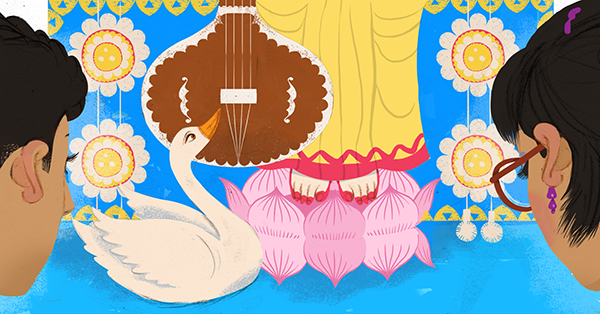 হয়তো একজন মনে মনে হাত ধরতে চায় আর একজনের, হয়তো একজন চিরকুট জমা দিতে চায় আর একজনের মুঠোর ডাকবাক্সে, সারা বছর একই স্কুলে থেকেও পারে না সেসব। সরস্বতী তাদের জন্য খুলে দেন এক হপ্তার এই সাহসী করিডোর। যেন তিনি নিজেই পাহারা দেন অলক্ষ্যে, এইসব মিহি বিনিময় যাতে ধরা না পড়ে। আমাদের ছোটবেলায়, এই কারণেই হয়তো, দেবী সরস্বতীকে কেমন মানুষ-মানুষ মনে হত। যিনি পড়াশোনার দেবী হয়েও কড়া নন, বরং প্রশ্রয়প্রবণ। যিনি সঙ্গীতের দেবী হয়েও দুরূহ নন, বরং প্রসাদ সাজাতে সাজাতে দু’এক কলি হিন্দি গান গেয়ে ফেললে রাগ করবেন না। ঠিক এই কারণেই দেবী সরস্বতী ছিলেন আমাদের কাছের জন, আপনার মানুষ। প্রেমিকাকে বলতে না পারি, তাঁর পায়ের কাছে অঙ্ক আর ইতিহাস বই নামাতে নামাতে বিড়বিড় করে বলতেই পারতাম, ‘দেখো মা, ও যেন হ্যাঁ বলে।’