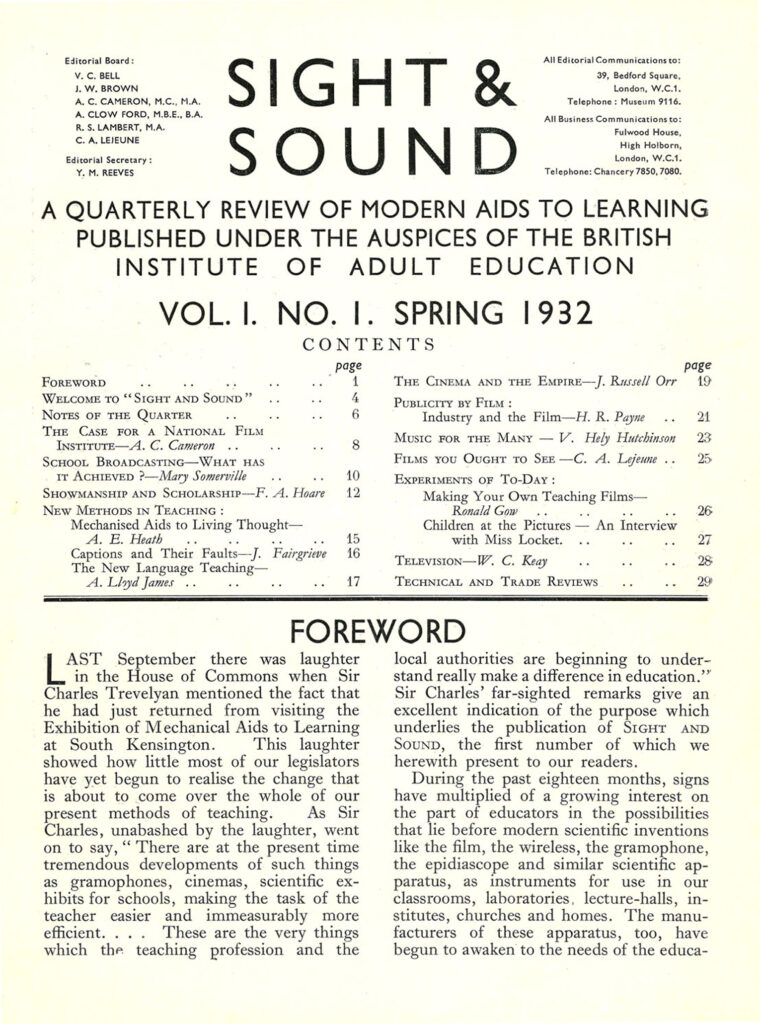 গত শতকের তিনের দশকের শুরু। চলচ্চিত্র মাধ্যমটির বয়স তখন বেশি নয়, আর সবাক চলচ্চিত্র তো সবেমাত্র পথ চলা আরম্ভ করেছে। এইরকম একটা সন্ধিক্ষণে শিক্ষার হাতিয়ার হিসাবে চলচ্চিত্রচর্চাকে প্রতিষ্ঠিত করতে চেয়েছিল লন্ডনের ‘সাইট অ্যান্ড সাউন্ড’ পত্রিকা। এই পত্রিকা প্রকাশ পাওয়া শুরুই হয় ব্রিটিশ ইনস্টিটিউট অফ অ্যাডাল্ট এজুকেশন-এর তরফ থেকে। একদিন যে-‘সাইট অ্যান্ড সাউন্ড’ বিশ্বচলচ্চিত্র নিয়ে বোঝাপড়ার অন্যতম গুরুত্বপূর্ণ ক্ষেত্র হয়ে দাঁড়াবে, শুরুয়াতি পর্বে সেখানে অধিকাংশ লেখাপত্রের লক্ষ্যই ছিল মুখ্যত শিক্ষাবিস্তারের পরিপ্রেক্ষিত থেকে সিনেমা ও তার প্রযুক্তিগত ব্যবহারকে ধরতে চাওয়া। ১৯৩২ সালের বসন্তে প্রকাশিত প্রথম বর্ষ প্রথম সংখ্যার মুখবন্ধে এ-কথা স্পষ্ট বুঝিয়েও দেওয়া হয়—