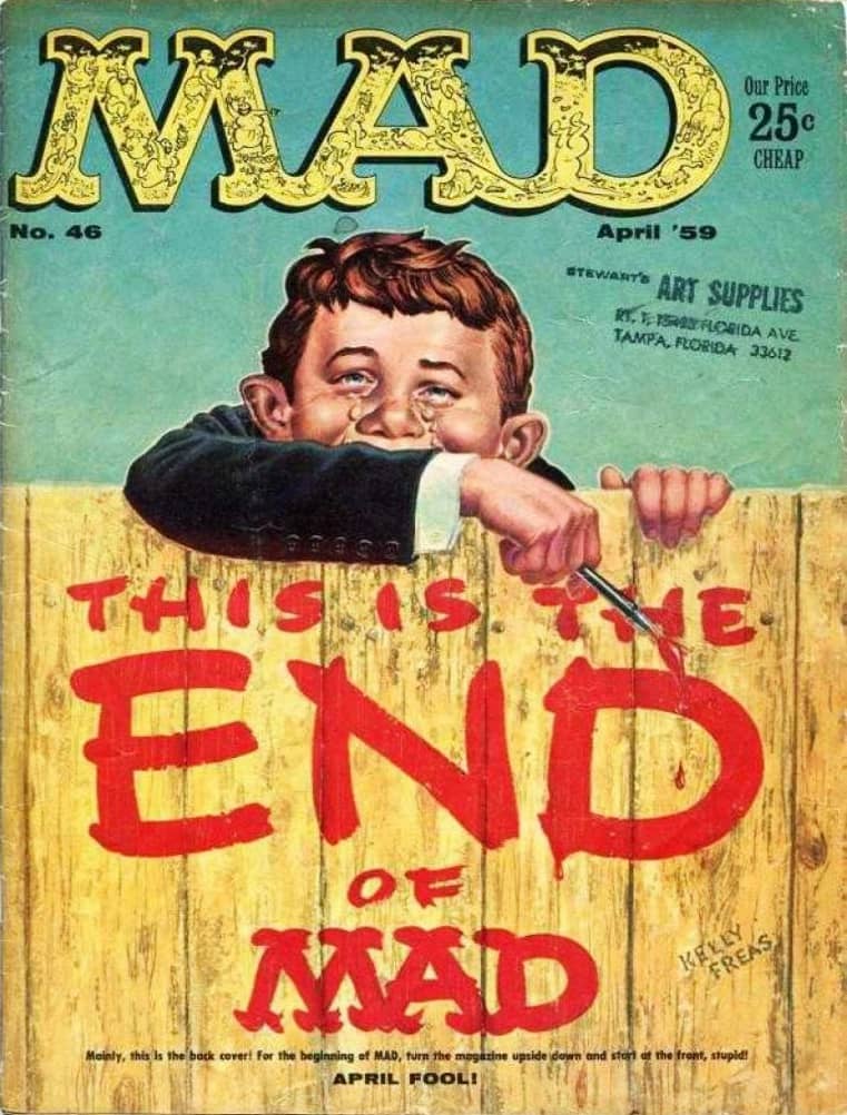 শুধু অন্যকে নিয়ে মজা করাই নয়, সময়ে-সময়ে নিজেদের নিয়েও হাসি-মশকরা হয়েছে। কখনও প্রচ্ছদে নিউম্যানের কাট-আউটের আদলে শূন্যস্থান রেখে তার উপরে সেঁটে দেওয়া হয়েছে চিরকুট, যাতে লেখা পাঠকের উদ্দেশে সম্পাদকের বার্তা— ‘Due to the slumping economy, we cannot afford the services of mascot Alfred E. Neuman on this cover./Please help us bring him back by purchasing several copies of this issue.’ আবার কখনও, প্রচ্ছদে বড়-বড় অক্ষরে লেখা হয়েছে— ‘This is the End of MAD’। নীচে ক্ষুদ্রকায় হরফে ছাপা নির্দেশ থেকে মুহ্যমান পাঠক অচিরেই বুঝেছে, বস্তুত এটি প্রচ্ছদের আদলে নির্মিত পৃষ্ঠপ্রচ্ছদ— ‘ম্যাড’ মোটেই বন্ধ হচ্ছে না— এ নেহাতই ‘এপ্রিল ফুল’-এর মরসুমি প্র্যাঙ্ক! তরুণ প্রজন্মের কাছে ‘ম্যাড’-এর অন্যতম গুরুত্বপূর্ণ ভূমিকা ছিল যে, সে আশপাশের সব কিছুকে অবিশ্বাস করতে শিখিয়েছিল। সরকার থেকে মিডিয়া— সবাই যে জনগণকে প্রতিনিয়ত ধোঁকা দিচ্ছে, হালকা কথার ছলে এই ভারী বিষয়টি বারে বারে বুঝিয়েছে ‘ম্যাড’। এমনকী, মিডিয়া হিসেবে নিজেকেও সে ওই তালিকা থেকে বাদ দেয়নি! ‘ম্যাড’-এর দর্শনও যে তা-ই, সে-বিষয়ে খোলসা করতে দ্বিধা করেননি উইলিয়াম গেইনস। তাঁর সাফ কথা ছিল— ‘We must never stop reminding the reader what little value they get for their money!’ এই বয়ান নানাভাবে পত্রিকার পাতায় উঠেও এসেছে।