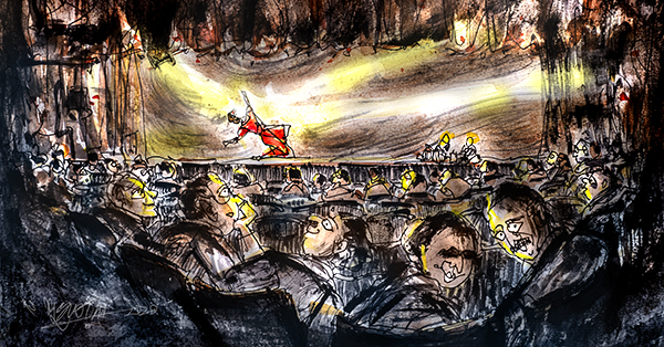 পরিকল্পনামাফিক শুভেচ্ছা-বার্তাটি পড়া হলে কয়েক মিনিটের মধ্যেই প্রেক্ষাগৃহের আলো ফিকে করে দেওয়া হল, পর্দা সরে গেল, আর স্টেজের বাঁ-দিকে (দর্শকদের দিক থেকে দেখলে) একটি ডায়াসের উপর বসা সহযোগী বাজনদারদের উপর জ্বলে উঠল এক হলদেটে আলো। সূর্যমুখী ফুলের রঙের হলুদ কুর্তা আর মেডেল পরে গঙ্গাভাইয়া যেন ঝলমল করছিলেন, তবে আসর মাতানো শুরু করল বাজনদারদের সারিতে নিচে বসা পিঙ্কু— একটি ইলেকট্রিক তানপুরা অন করে, তার কাছে একটি মাইক রেখে আওয়াজটা বাড়িয়ে একের পর এক তিনখানা জবরদস্ত ‘ওম’ ছাড়ল সে! পিঙ্কু যখন গণপতি বন্দনা শুরু করছে, টুকটুকে লাল রঙে ভূষিতা হয়ে তখন ধীরে ধীরে মঞ্চে প্রবেশ করলেন নির্মলা। দর্শকদের মধ্যে আঁতকে ওঠার শব্দ কানে এল, নির্মলাকে হেলতে-দুলতে স্টেজে উঠতে দেখে বেশ কয়েকজনকে চেপে রাখতে না পেরে ফিক ফিক করে হাসতেও শোনা গেল স্পষ্ট।