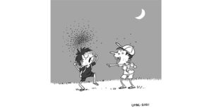 আশ্চর্য ব্যাপার হল এই যে, হাসির কারখানা চলছে। মিঠে হাসি, খোনা হাসি, দমফাটা হাসির ঝলকে মিইয়ে যাচ্ছে শহরের আকাশ। হোমরা চোমরাদের বাড়ি বাড়ি বিলি হচ্ছে চড়া দামের হাসি, গরিবদের মধ্যেও কি পৌঁছচ্ছে না মুচকি হাসির কিছু ত্রাণবাক্স? তারই মধ্যে এক ট্যুরিস্ট তার পাথরভর্তি পিঠব্যাগ ও স্মৃতিহীন সারমেয়টিকে নিয়ে খুঁজছে আস্তানা। অবিলম্বে তার দরকার কিছু খাদ্য, একটু দুধ ও খবরের কাগজ, গত শতকের। যুদ্ধের ক্ষতগুলো সে মিলিয়ে দেখতে চায় তারিখের সঙ্গে, মৃতদের তহবিল জরিপ করতে চায় শিরোনাম প’ড়ে। এই হো হো হাসির প্রখর রোদের গনগনে গালফোলা শহরে কেউ তাকে দরজা খুলে দেবে বলে মনে হয় না। শব্দের ঝনঝনাৎ-এর সামনে তার তল্লাশি নেহাত হার মানবে বলেই মনে হয়। তবু, এই দুপুরের হাসি-লাগা চওড়া সুনসান রাস্তায় সে ভেসে চলেছে এক আলোকরেখার মতোই। আশ্চর্য ব্যাপার হল এই যে, তারও ঠোঁটে লেগে আছে, মৃদু এক হাসি।