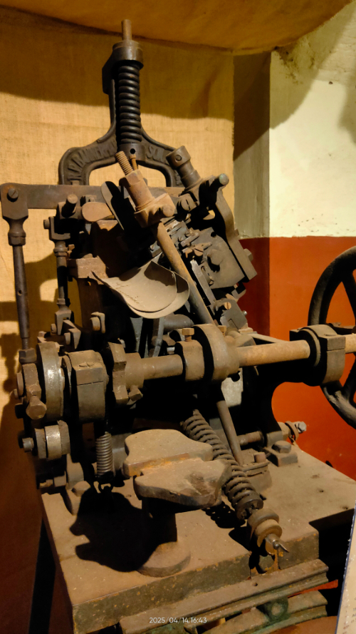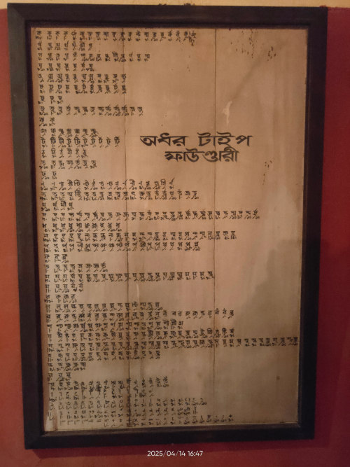 এ-পর্যন্ত তাও চালিয়ে দেওয়া যায়; বিক্ষিপ্তভাবে কিছু টাইপফেস, কিছু পুঁথি, কিছু নকশি কাঁথার সমাহার। আলো থেকে আঁধারে যেতে আরও বিচলিত হতে হয়। খেলাত ভবনের বেসমেন্টের অন্ধকারে কৃত্রিম হ্যারিকেনের বালবের আলোয় সার দিয়ে সব ফ্রেম ঝুলছে; আধুনিক সব ছবির সমাহার; মডার্ন ব্যবস্থাপনা; এর সাথে পঞ্চানন কর্মকারের কী সম্পর্ক তা বোঝার চেষ্টা বৃথা বইকি। এই অংশে অন্যান্য কয়েকটি এলোমেলো জিনিসপত্রের (ছেনি, হাতুড়ি-সহ অনুল্লিখিত কিছু সরঞ্জাম) সাথে চারটি টাইপসেটিং মেশিন রাখা আছে। প্রতিটি মেশিনের সামনে গেলে বোঝা যাবে আলাদা-আলাদা। অথচ সঙ্গে ছোট্ট সান বোর্ডে উদ্যোক্তাদের বয়ানে লেখা আছে একই কথা। চারটি মেশিনের কাজ যে একই নয়, তা যে-কেউ বুঝবেন। ১৮০৪ সালে পঞ্চানন কর্মকার মারা যাবার বেশ কয়েক বছর পর ১৮০৯ সালে ব্রিটেন থেকে শ্রীরামপুরে এগুলো আনা হয় বলে উল্লেখ করা হয়। এ-তথ্যের সত্যতা নিয়ে প্রশ্ন জাগে; ইতিহাসের প্রমাণ নেই এখানেও। এবং আবারও বুঝি, এর সাথে পঞ্চানন কর্মকারের যোগ নেই। আগের হ্যান্ড মোল্ড মেশিনের থেকে অনেকটা উন্নত এই মেশিনগুলোর ব্যাপারে খুব বিস্তারে জানার সুযোগ একেবারেই নেই। এতে ঠিক কী কাজ হত? এগুলোর ব্যবহার কোথায় হয়েছিল বা ধরা যাক এর কার্যক্ষম কত সাল পর্যন্ত ছিল?