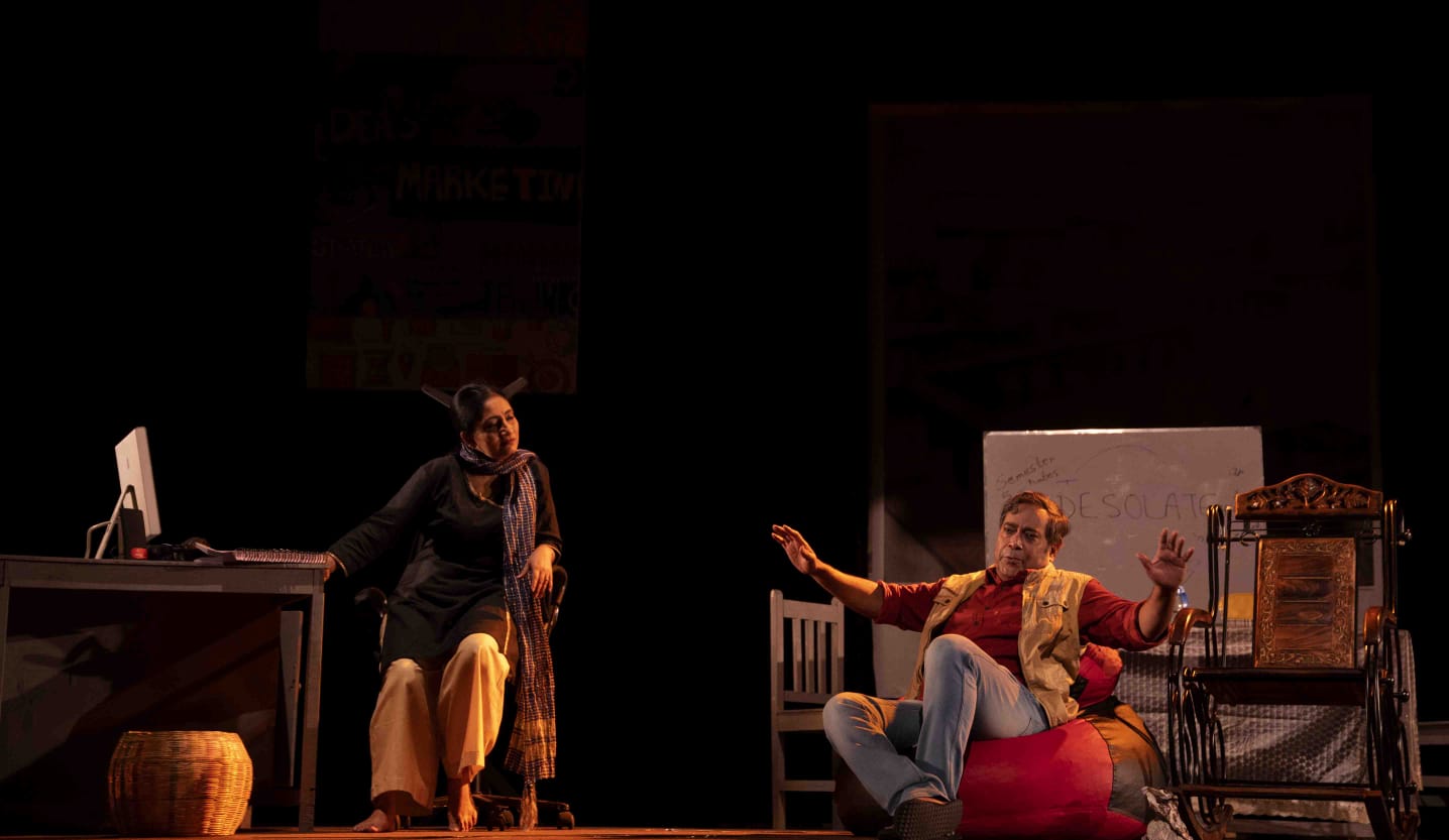 নাটক শুরু আগে যে আবহসংগীত বাজছিল তাতে ১৯৯০র দশকের মাঝামাঝি সময়কার টেলিভিশন কমার্শিয়ালের টুকরোটাকরা শুনছিলাম আমরা। রাজীব নায়েক এই নাটকটা লিখেছিলেন ১৯৯৮তে। সুমন ওই সময়কালকে টেনেহিঁচড়ে আজকের দিনে আনেননি। ল্যাপটপের বদলে অভয়ের নাকের ডগায় ডেস্কটপ কম্পিউটার বসিয়ে দিয়েছেন। ঠিক করেছেন। মোবাইল ফোন আমাদের জীবনকে যে অনন্ত জটিলতায় বেঁধেছে (এবং ছিঁড়েখুঁড়ে খেয়েছে) তার আঁচ লাগতে দিলে রিলেশনশিপ ড্রামার টানটান মেজাজ টসকে যেত। মনস্তাত্ত্বিক বিশ্লেষণের জায়গাটাও আখেরে নড়বড়ে হয়ে যেতে পারত।
