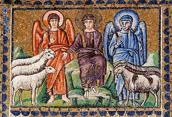 The Gospel of Matthew states that on the Day of Judgement, Jesus shall separate the sheep (those who were obedient to God) from the goats (those who were independent minded and, so, disobedient). The sheep will be to his right, and go to heaven, and goats to the left, and go to hell. This scene is depicted in a sixth century mosaic known as âThe Last Judgement in Ravennaâ, in the Basilica of SantâApollinare Nuovo, Italy. Here, a red angel sits on the right of Jesus helping him with the sheep, while a blue angel sits on his left helping him with the goats. This blue angel is considered the first depiction of the Devil in Christian art. Then, 500 years later, at the last judgement mural at Torcello Cathedral in Venice, we find for the first time hell being depicted as full of fire where people are being tortured by blue-winged devils. From the 16th century onwards, the Devil appeared as a goat-like creature. Those who opposed God were called Devil-worshippers. The form came from Pan, the half-goat god of Greek mythology associated with wilderness and from Hades, god of the underworld.