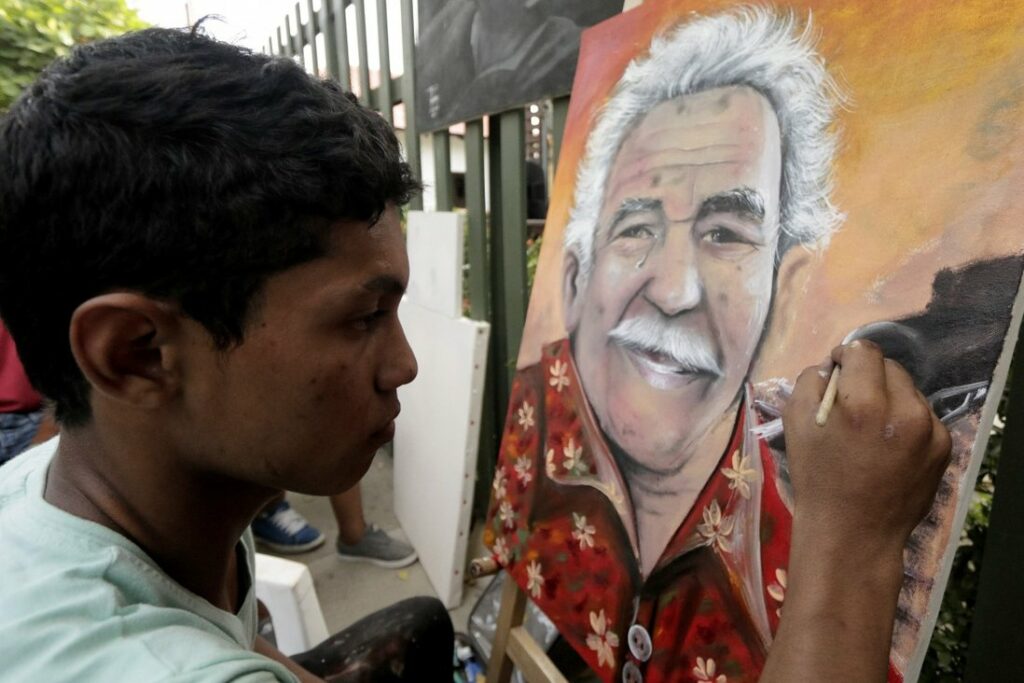 A young artist paints a portrait of Garcia Marquez in Bogota, Colombia