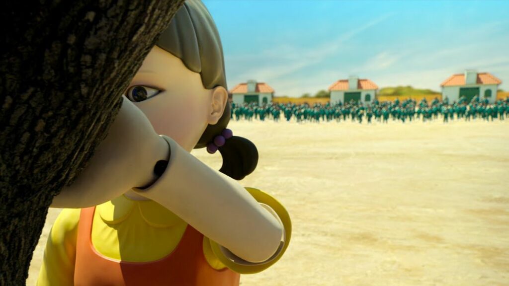 Of all the uncanny images in Squid Game, the most terrifying one is that of a giant-sized playground doll, a girl doll. The doll sings a childrenâs rhyme that accompanies the move-or-freeze game âRed Light, Green Lightâ in a mechanical singsong. As the clock ticks and the game speeds up, the consequences of losing in a mere playground game unfold on a barren field in the middle of a Pacific island. The horror intensifies with that particular song, speeding up every minute, in that robotic, unnerving, distressingly un-human voice.Â