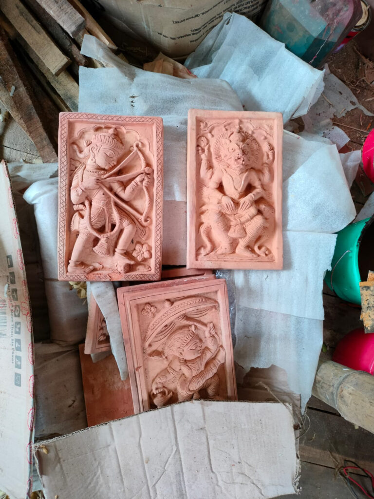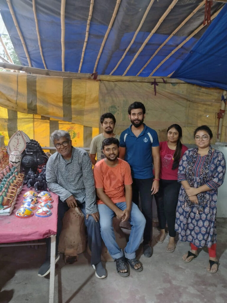 পার্থর ছয় সহযোগী এ-বার ঠাকুরপুকুরে; শিল্পের ছাত্র-ছাত্রী এক ঝাঁক তরুণ-তরুণী দিন-রাত পরিশ্রম করে চলেছেন বনবিবি, বাস্তুদেবতা, মাটির সরা, উড কাট, অবিভক্ত বাংলাদেশের ফরিদপুর অঞ্চলের মাটির পুতুল গড়তে। তাঁদের নিজস্ব প্র্যাকটিসের অঙ্গ ছাড়াও, লোকশিল্প নিয়ে এই যে ‘প্যারালাল জার্নি’, এতে তাঁরা সমৃদ্ধ হচ্ছেন, বলা বাহুল্য। স্বাধীনতার ৭৫ বছরে, উদ্বুদ্ধ তারুণ্যের প্রতি পার্থর মনোযোগ যেন দুর্গার আরাধনাকে রিফর্মেশনের প্ল্যাটফর্ম হিসাবে মনে করিয়ে দেয়; একজন প্রকৃত শিক্ষক এবং মেন্টরের ভূমিকা যে একজন নবীন শিল্পীর জীবন এবং শিল্পবোধে কতখানি গুরুত্বপূর্ণ, তা উপলব্ধি করি।