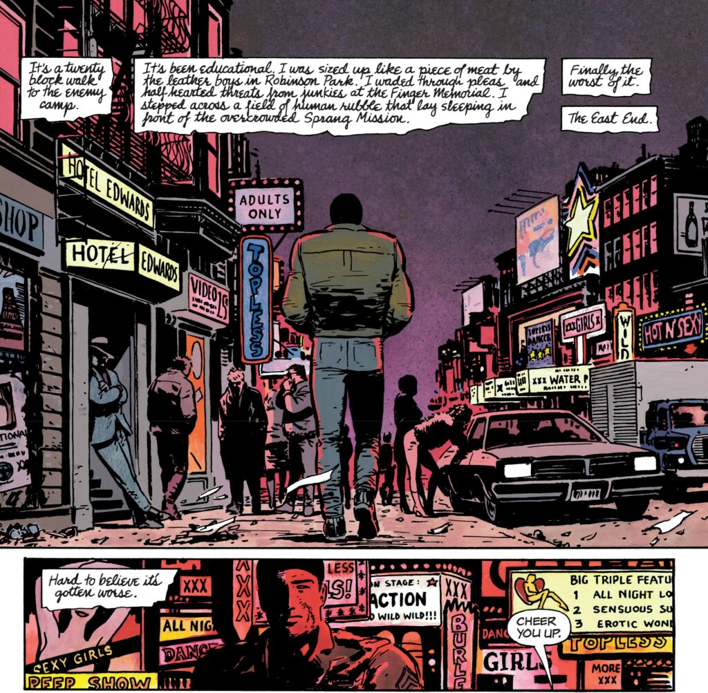 আবার অন্যদিকে, কমিক্সে হাইলাইটের জন্যে রিচমণ্ড লিউইস প্রচুর লাল, গোলাপি, কমলা আর আকাশি রঙের ব্যবহার করেছেন। লাল, নীল আর গোলপি নিওন আলোয় গথামের রেড-লাইট এলাকা এক ধরনের উগ্র সৌন্দর্য প্রকাশ করে, যার মাদকতা অস্বীকার করা সম্ভব নয়।