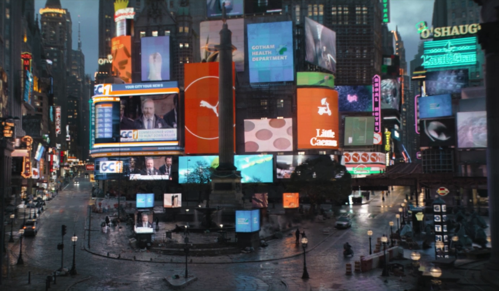 সিনেমায় এইরকম নিওনের ব্যবহার করা হয়েছে, যদিও অনেকটা পরিমিত ভাবে। গথামের মুখ অসংখ্য বিজ্ঞাপনের সাইনবোর্ডে ঢেকে গেছে। সেই সাইনবোর্ডের কড়া আলোয় বৃষ্টিভেজা রাস্তাগুলো শুয়ে থাকা সাপের মতো দেখায়।