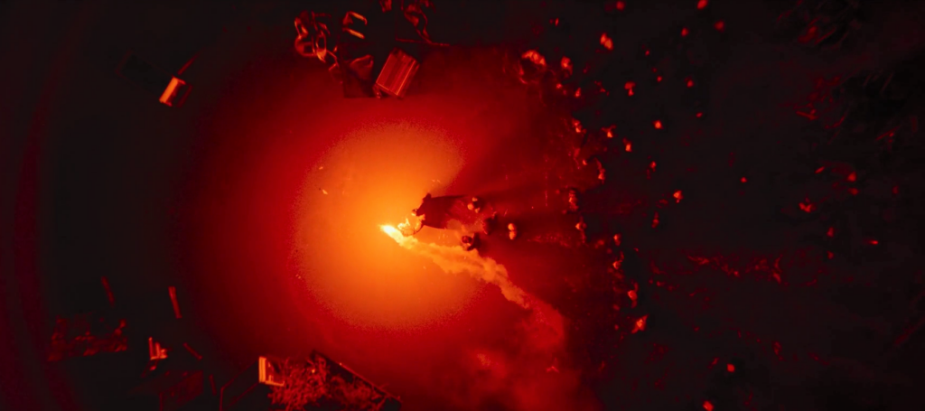 সেদিক থেকে সিনেমায় লাল রঙের গুরুত্ব একটু বেশি। প্রথমে, এই রঙের মাধ্যমে ব্যাটম্যানের মধ্যে জমে থাকা আক্রোশ বোঝানো হলেও, পরে এর অন্তর্নিহিত অর্থ পরিবর্তিত হয়ে যায়। গল্প এগোনোর সাথে-সাথে ব্রুস বুঝতে পারে, ব্যাটম্যান হয়ে শুধু ভয়ের উদ্রেক জাগালেই হবে না, বরং তাকে সাধারণ মানুষের মনে আশার আলো জাগিয়ে তুলতে হবে। সিনেমার ক্লাইম্যাক্সে সিনেমাটোগ্রাফার গ্রেগ ফ্রেজার একটা দারুণ ওভারহেড শট আমাদের উপহার দিয়েছেন। ধ্বংসাবশেষের মাঝে, হাতে লাল ফ্লেয়ার ধরে ব্যাটম্যান গথামবাসীদের পথ দেখিয়ে যাচ্ছে। চারিদিকে জল আর অন্ধকার। এখানে লাল রং হয়ে গেছে আশা আর সাহসিকতার প্রতীক।