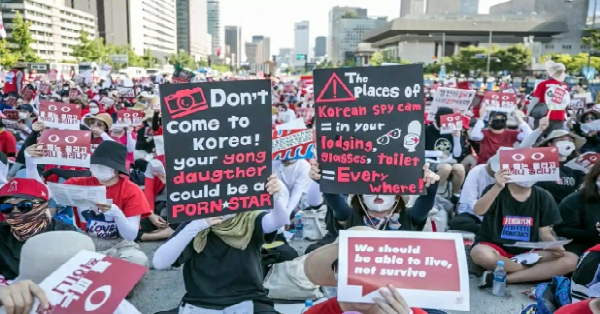 এমন দমচাপা একটা জীবন কাটাতে কাটাতেই, ২০১৮ সালে, একদিন টুইটারে স্ক্রোল করার সময়, ইয়ংমি সিওলের রাস্তায় একটা বিক্ষোভের ফুটেজ দেখতে পায়। দক্ষিণ কোরিয়ায় সাধারণত নারীহত্যা, রিভেঞ্জ পর্ন এবং ডেটিং-সংক্রান্ত হিংসার ঘটনা ব্যাপক, স্পাই-ক্যামের মাধ্যমে নগ্ন ভিডিও বানিয়ে ছেলেরা বুক ফুলিয়ে ঘুরতে পারে। যদি কখনও ব্যাপারটা বিচারব্যবস্থা অবধি পৌঁছয়, তখন তাদের বেশিরভাগই জরিমানা দিয়ে ছাড় পেয়ে যায়। অথবা জেল-হাজতের নির্দেশ হলেও, তা কোনও কারণে অনির্দিষ্টকালের জন্য স্থগিত হয়ে যায়। এরই মধ্যে একটি ২৫ বছরের মেয়ে, আর্ট স্কুলে একটি নগ্ন পুরুষ মডেলের ছবি তোলে এবং মডেলের সম্মতি না নিয়েই সেটা অনলাইনে পোস্ট করে; তাকে ১০ মাসের কারাদণ্ড দেওয়া হয়েছিল এবং আদালতের নির্দেশে তাকে কাউন্সেলিং করা হয়, যাতে ভবিষ্যতে এমন যৌন-অপরাধ সে না করে। যে ফুটেজটা ইয়ংমি দেখেছিল, সেই বিক্ষোভ ছিল কোরিয়ান বিচার-ব্যবস্থার নির্লজ্জ ভণ্ডামির বিরুদ্ধে প্রতিক্রিয়া।