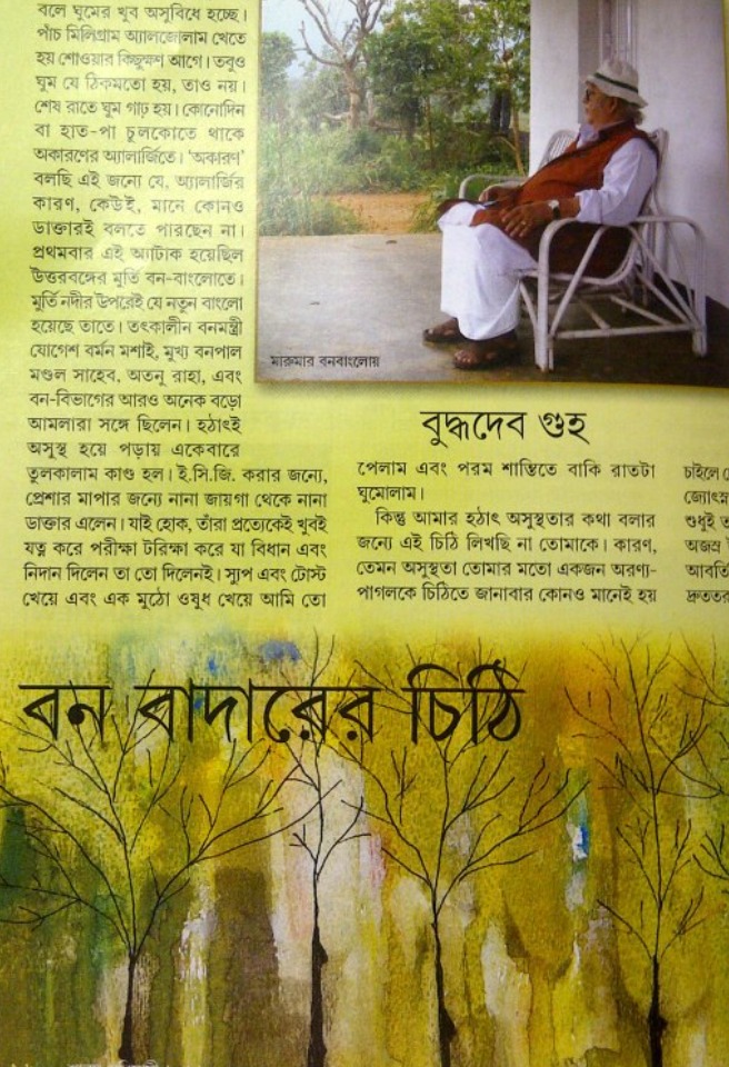 ‘বলছ? কী লিখি বলো তো!’ সাহস সঞ্চয় করাই ছিল, আবদার করলাম, ‘আপনার জনপ্রিয় লেখাগুলোর বিহাইন্ড দ্য সিনগুলো।’ হেসে উড়িয়ে দিতে পারতেন। দিলেন না। খুব শান্ত, সিরিয়াস মুখে একটু চুপ করে রইলেন। ‘ওসব লেখা কি ঠিক হবে?’ আমরা চুপ। কীসব লেখা? কার কথা? কোন আসল ঘটনা? বহু নামকরা বাড়ি, মহল, এস্টেট, অলিন্দে ওঁর স্বচ্ছন্দ যাতায়াত। যা দেখার ঠিকই দেখেছেন, বুঝেছেন, লিখেওছেন। সাহিত্যিকের স্বাধীনতায় আসল চরিত্র হয়তো কলকাতা ছেড়ে উড়ে গেছে বেতলায়। মারুমারের কাঠবুড়ো গুগুনোগুম্বারে। বুদ্ধদেবের ক্যামেরা বাঘের ওয়াটার-হোল থেকে বাথরুমের কি-হোলে চোখ রেখেছে সমান উৎসাহে। লুকিয়ে করেছেন তা নয়, অজস্র হুইসলিং টিল, হাওয়ায় হাসাহাসি করা জ্যাকারান্ডা গাছের পাতারা সাক্ষী ছিল বইকি। উপন্যাসে, গল্পে তার অকপট প্রমাণ ভূরি ভূরি। ‘এমনিতেই লোকে কত কী বলে, এবারে তো আমাকে মারবে।’ আন্দাজ করলাম, বয়সকালের বুদ্ধদেবের ক্লান্তি নামছে। কথায়-কথায় উইনচেস্টার রাইফেলে টোটা ভরার সাহস পাচ্ছেন না আর, ঋজুদার মতো। চুপ করে রইলাম। এর এক সপ্তাহের মধ্যে ডাক পড়ল। খাম পেলাম। একটু বড়। পাণ্ডুলিপির সঙ্গে নিজের হাতে আঁকা ছবি। শুরু হল ধারাবাহিক, ‘বনবিহারীর স্মৃতিচারণ’। বইও হল, হুড়মুড় করে বেরিয়ে গেল কয়েকটি সংস্করণ। আমাদের পত্রিকা আমরা খুব বেশিদিন চালাতে চাইনি, পারিনি। আমাদের জীবন বদলাচ্ছিল, সময় কমে যাচ্ছিল। উনি নিশ্চয়ই বুঝেছিলেন, কিছু বলেননি, ডেকে পাঠাতেন, গল্পসল্প আগের মতোই।