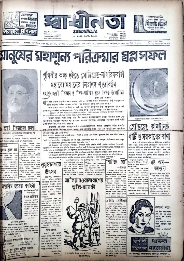 পরপর কয়েকদিনের ‘স্বাধীনতা’-র প্রথম পাতা জুড়ে, জালিয়ানওয়ালাবাগের স্মৃতিস্তম্ভ আর আসন্ন রবীন্দ্র-শতবর্ষের গুটিসুটি খবর ছাড়া, বাকিটা নিরবচ্ছিন্ন সোভিয়েত-বন্দনা আর মহাকাশ-চর্চা।