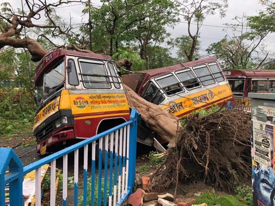 কলকাতায় আমফানে গাছ উপড়ে এসে মিনিবাসকে দুমড়ে দিয়েছে
