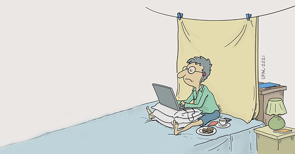 ওরে কোভিড, আর সব কেড়ে নে, আমাদের লুকোনোর জায়গাগুলো কেড়ে নিস না। বাবা যদি অফিসে যাওয়া ছেড়ে ডালগোনা বানায়, সন্তানের আর কী কাজ থাকতে পারে চাল গোনা ছাড়া! ভাবুন, বয়ঃসন্ধির একটি মেয়ে একটি ছেলেকে বলছে, ‘আমাদের যা করার পাঁচটার মধ্যে করতে হবে, তারপর বাবা-মা insta reel করবে।’ একে তো স্কুল নেই, তাই পেটব্যথা, গা বমি-বমি ডাইনোসর হয়ে গেছে। তার উপর যাদের টাই পরে ঘোরার কথা, তারা বেরোচ্ছেই না বাড়ি থেকে। চরম অশ্লীলতা। বাবাকে অনেকক্ষণ অবধি সহ্য করা যায়, শুধুমাত্র এই প্রতিশ্রুতির বিনিময়ে যে, তাদের অনেকক্ষণ সহ্য করতে হবে না। নিজে বাবা হয়েই কথাটা বলছি। সারাক্ষণ বক্সার পরে বাবা চারপাশে জগিং করছে আর ওয়ার্ক ফ্রম হোম করছে— এ এক অর্থে শৈশবের ডেথ সার্টিফিকেট।