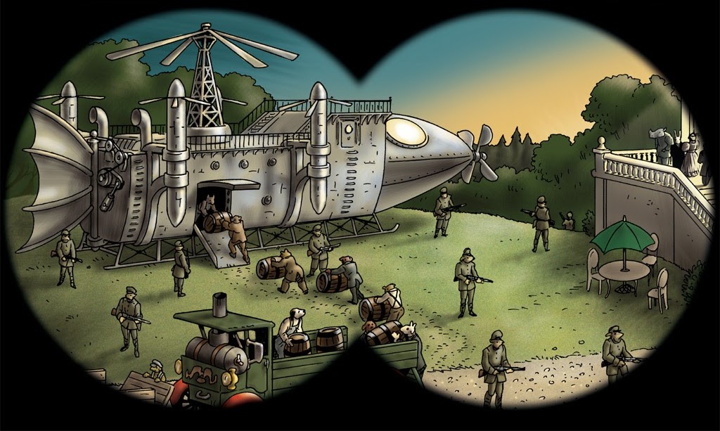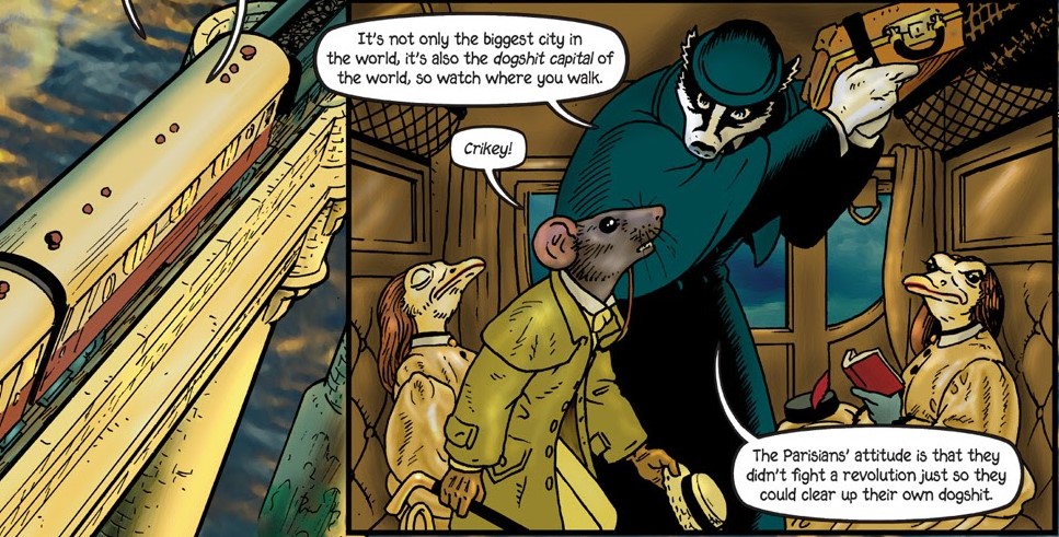 যানবাহন যত না অদ্ভুত, তার থেকেও বেশি অদ্ভুত তাদের চালক আর আরোহীরা। একদম সামনের ক্যারিজে বসে চেক-কাটা কোট প্যান্ট আর টপ হ্যাট পরা এক ভোঁদড়। আর তাকে ধাওয়া করতে করতে এগিয়ে আসছে কালো ইউনিফর্ম পরা শেয়াল, কুকুর, গিরগিটি, বন্য শূকর, ইত্যাদি।