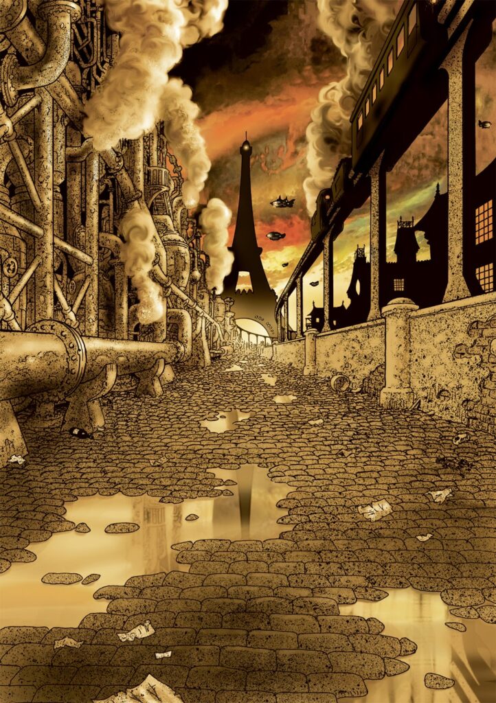 বাষ্পাকুল শহর। এক দিকে দেওয়াল বেয়ে বেয়ে অসংখ্য পাইপের ঘিঞ্জি। অন্যদিকে একটা রেলগাড়ি ধোঁয়া উগড়াতে উগড়াতে নিজ গন্তব্যের দিকে ছুটে যাচ্ছে। অনেক অনেক দূরে আইফেল টাওয়ারের সিল্যুট দেখা যাচ্ছে। পাথর-বসানো রাস্তায় জল জমে। সেই জলে দূরের আইফেল টাওয়ার প্রতিফলিত হচ্ছে।
