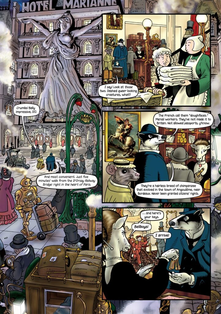 ব্রায়ান ট্যালবটের অভূতপূর্ব এই দুনিয়াটাকে আসলে ওইভাবেই বর্ণনা করা সম্ভব। আমাদের দুনিয়ার মতোই ভৌগোলিক বিভেদ, সামাজিক খুঁটিনাটি; ইতিহাসের স্রোতও প্রায় এক (যা কিছু আলাদা সেটা একটু পরে বলছি)। শুধু মানুষের জায়গাটা প্রাণীরা দখল করে নিয়েছে। টপ অফ দ্য ফুড চেইনে শুধু একটা প্রজাতি নেই, আছে পুরো প্রাণীজগৎ। অবিশ্যি এদের দেখতে ঠিক আমাদের দুনিয়ার পশু-পাখির মতো নয়। সেই মিকি মাউস বা ল্যুনি টিউনসের মত অ্যানথ্রপোমর্ফিক। হাতি, ঘোড়া, শেয়াল, ছুঁচো, পায়রা, চিংড়ি, ইঁদুর… ‘গ্র্যান্ডভিল’ (Grandville) গ্রাফিক উপন্যাসের দুনিয়াটা ওর নায়কের মতই খ্যাপাটে।