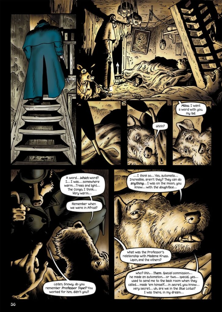 গ্র্যান্ডভিলের অনুপ্রেরণা নিয়ে এত কিছু বললাম কারণ নানা ঘরানার আর্ট নিজের বুকে জমিয়ে রেখে এই সিরিজটা সামান্য অ্যাকশন কমিক্সের থেকেও বেশি কিছু একটা হয়ে গেছে। রোবিডা আর জে জে গ্র্যান্ডভিলের প্রভাব সবথেকে বেশি প্রকট হলেও, ব্রায়ান ট্যালবট অসংখ্য ইস্টার-এগ প্রায় প্রতিটা পাতায় লুকিয়ে রেখেছেন। আমার সবথেকে প্রিয় ইস্টার এগ রয়েছে প্রথম ভল্যিউমে। তদন্তের স্বার্থে ল্যেব্রক আর র্যাটজি স্নোয়ি মিল্যু বলে এক কুকুরের খোঁজ করছিল। অনেক কাঠগড় পুড়িয়ে অবশেষে এক ‘poppy joint’-এ স্নোয়িকে তারা খুঁজে পায়। আফিমের নেশায় বুঁদ হয়ে থাকা স্নোয়ি নিজের মনে কীসব বিড়বিড় করতে থাকে। সে নাকি স্বপ্নে দেখেছে এক ‘ময়দামুখোর’ সাথে চাঁদে গিয়েছে। সে নাকি সেই লোকটার সাথেই আবার কঙ্গোতেও গেছে। স্নোয়ি আরও কিছু শব্দ আওড়াতে থাকে : ‘নীলকমল’, ‘সোনার কাঁকড়া’…