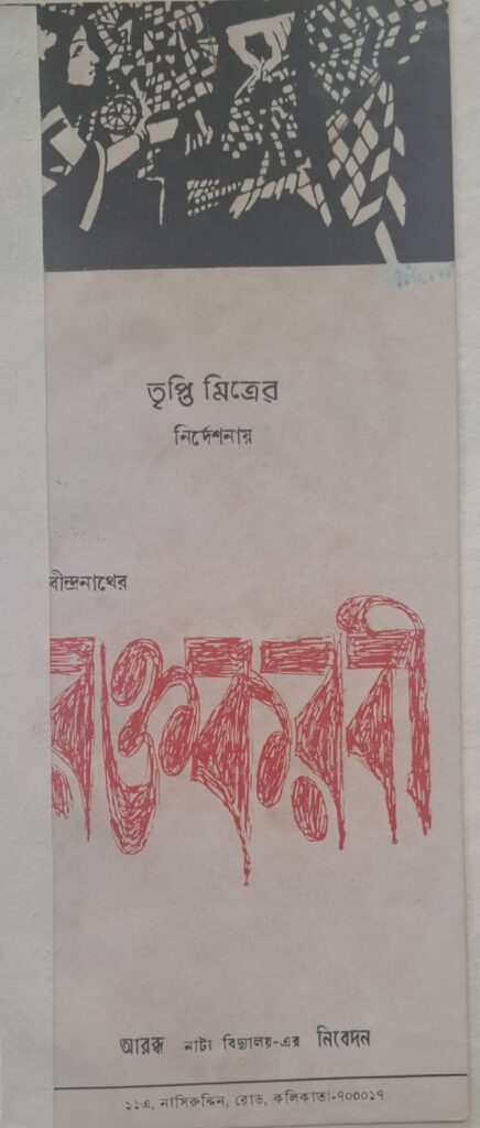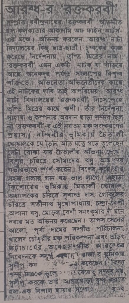 তৃপ্তি মিত্র নির্দেশিত ‘রক্তকরবী’র প্রথম হয়েছিল পাঠাভিনয়, শিশির মঞ্চে, ২০ মার্চ ১৯৮৪। ‘বহুরূপী’র প্রযোজনার মতোই আলো করেছিলেন, তাপস সেন, মঞ্চ ভাবনা খালেদ চৌধুরী।