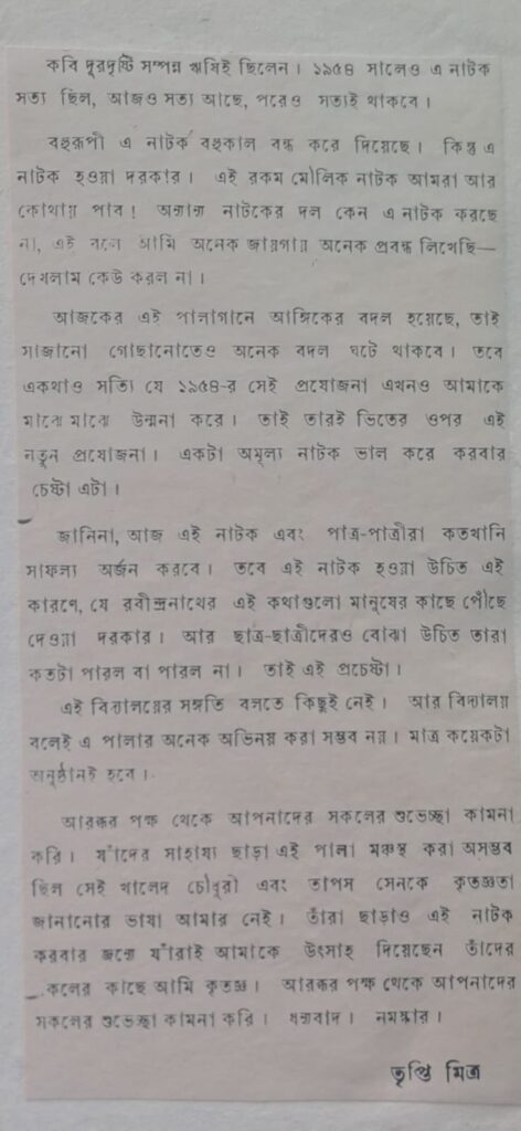 আপাতভাবে ধৃষ্টতা মনে হলেও, আমার মনে হয়— একদম ঠিক করেছিলাম সে-দিন ফোন করে; অনেক মানুষই তো সত্যিটা জানলেন না, আদপে কেমন হয়েছিল ‘রক্তকরবী’! অনেকে তো অভিনয় দেখেনইনি! পাঠও যদি যথাযথ ভাবে না শোনেন, তাহলে আর রইল কী!