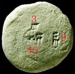 ব্যাবিলন থেকে পাওয়া যে-মৃৎফলকের কথা শুরুতে বলছিলাম, তার কথা বলি এইবেলা। সেখানে দেখা যাচ্ছে একটা বৃত্ত আঁকা, উপরে লেখা ৩, মাঝে লেখা ৪৫ আর ডানদিকে ৯।