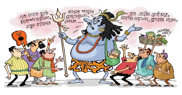 হ্যাঁ, বাপ-মা’র কাছে যাওয়ার সময় মনটা টনটন করে, তার মানুষটাকেই ওরা অবহেলা করছে, একবার ফোন করে কথা বলে না, লৌকিকতা করেও বলে না এবারটা তুমিও চলে এসো ওদের সঙ্গে, সুটকেস গোছানোর সময়ে এক-একবার মনে হয় ছুড়ে ফেলে দিই, এবার যাওয়া ক্যানসেল। কিন্তু তাকে দ্যাখো, হো-হো করে হেসে বলবে, সে কী হে, আমার এমন স্বাধীনতা তুমি ক্ষইয়ে দেবে? এই পাঁচদিন যে নন্দীদের বাড়িতেই আসতে বলে দিলাম, আবার ক্যারম টুর্নামেন্টও একটা ঠিক করে রেখেছি। প্লিজ তোমার হাত থেকে মুক্তির এমন সুযোগ কেড়ে নিও না। আর সত্যিই ধরাধরি করে সব্বাই দাবড়া একপিস ক্যারমবোর্ড দিয়ে গেল, আলোও ফিট করা হল তার ওপরে। অনেক রাত্রে ফিকফিক করে হেসে বলল, ঘুমোচ্ছ না যে, অ্যাদ্দিন পর আমায় নিয়ে এত ভাবার কী আছে? লোকটার বোধহয় কপালে একটা চোখ জ্বলজ্বলায়, যা দিয়ে মুখ পড়ে না, মন পড়ে। গলা খাঁকারি দিয়ে বলল, শোনো, তোমার বাপ-মা যদি আমায় মেনে নিত, তাইলেই বরং হার্ট অ্যাটাক হত। এত বোদা লোকেরা আমার মূল্য বুঝে ফেলল? তবে তো কিছু গোড়ায় গলতি হয়ে গেছে। শেষে নেক-টাই না পরতে হয়। এবার আর পার্বতীর না হেসে উপায় কী, খালি গায়ে টাইয়ের বহর ভেবে? ঢাকঢোলঢ্যাঁড়ার শোরগোল দেখতে দেখতে প্যান্ডেলে দাঁড়িয়ে সে ভাবে, মর্তের লোকেরা উপেক্ষা করে? তাদের দেখে কাঁসরঘণ্টা বাজায়, কোমর দোলায়, হাতজোড় করে, আর যে-লোকটা পরিবারের কর্তা, যে তাদের ভ্রমণপথ চকখড়ি দিয়ে এঁকেছে, তাকে একবারও পোঁছে না? না-ই করল। ডেকে নিয়ে এসে অনাদর করা, বা না-বুঝে সমাদর করার চেয়ে তা ঢের ভাল। এদের জ্ঞানগম্যি নাহয় ছেতরে গেছে, স্মৃতিশক্তিও কি নেই? যে-লোকটা গুচ্ছের অপ্রিয় কথা চেঁচিয়ে বলে আদায় করেছে নীচুতলার মানুষের অধিকার, যে-লোকটার গলায় এখনও মারের দাগ নীল হয়ে আছে, যে-লোকটার জন্যে অমৃতের স্বাদের দিকে এরা ঢলে পড়তে পারছে বারবার, তার কথাই ভুলে থাকা যায় এত অনায়াসে? তারপরেই বুকের মধ্যে শুনতে পায় তার স্বর, ধুস, এ নিয়ে কেউ ভাবে? হাততালির জন্যে কেউ কাজ করে? তুমি তো ভোলোনি, ব্যাস, মিটে গেল। আড়চোখে চেয়ে যেন মনে হয়, চালচিত্রের ওপরদিক থেকে মিটমিট হাসছে। তাহলে কি উপেক্ষাকে কাঁচকলা দেখিয়ে সে আছে, সারাক্ষণ, পাশেই? কে জানে? পার্বতীর মনটা মিহিন ভিজে আসে। ভাবেন, রেড-টা ফেলতে পারে যেন টুর্নামেন্টের ফাইনালে, নইলে যা গাঁকগাঁক করে চেঁচাবে, বাব্বা!