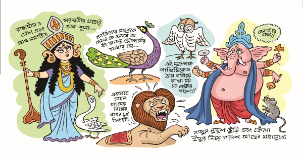 সার্বিক এবং সম— এইসব শব্দ যতই যা ভাবি না কেন, মনের মধ্যে লুকিয়ে রাখা সেই স্কেলটায় সমানেই চলতে থাকে মাপামাপি। মুখ্য আর গৌণের বাছবিচার। এমনকী তা ঠাকুর দেখতে বেরিয়ে, মা দুর্গার মূর্তির সামনে দাঁড়িয়েও। পুজোটাও যেহেতু মা দুর্গার নামে তাই হঠাৎ করে খটকা লাগে না। কিন্তু ভাবনার জটিল মাকড়সা-জালে আটকে পড়া পোকার মতো ছটফট করতে করতেও মনে হয় এমনটা কেন! এক চালচিত্রে কেন সবাই সসম্মানে সমান মাপের নয়! চোখ সরু করে দেখি আর ভাবি। শুধুমাত্র বিন্যাস সুন্দর করা, না কি শাস্ত্রকারদের অন্য কোনও বিচার আছে এর পিছনে! না জানি শাস্ত্র, না পারি মূর্তি গড়তে। ফলে মাথা খাটিয়ে এটা সেটা ভাবা ছাড়া আর উপায় কী! কে-ই বা বসে আছে এসবের উত্তর দেওয়ার জন্য উন্মুখ!