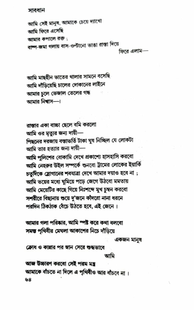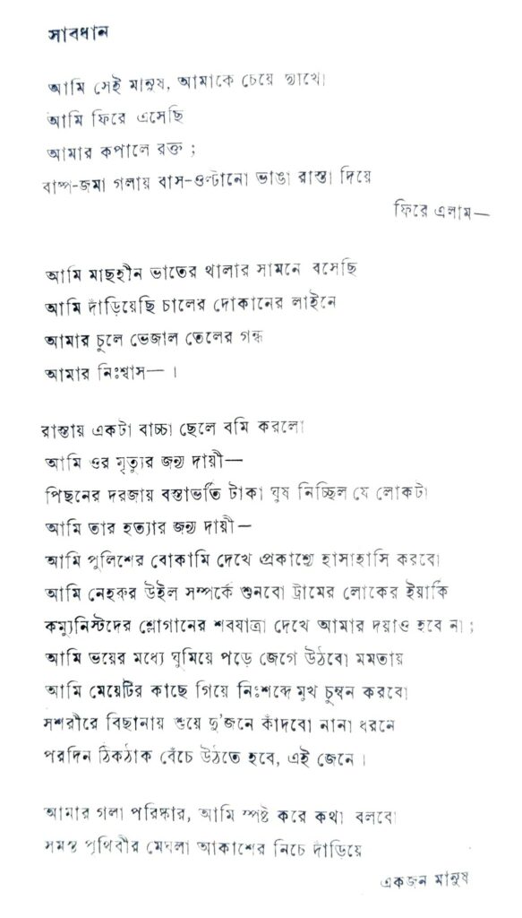যাই হোক, কবিতাটির দিকে তাকানো যাক। কবিতার নাম ‘সাবধান’। প্রথম এবং দ্বিতীয় সংস্করণে ছাপা আছে—