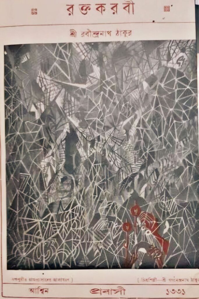 ফিরে আসি কিশোর নন্দিনীর কথায়; ১৯৩৪ সালে বিহারে ভূমিকম্প-পীড়িত দুর্গতদের সাহায্যার্থে প্রবোধেন্দুনাথ ঠাকুর-এর ‘দ্য টেগোর ড্রামাটিক গ্রুপ’ আয়োজন করল ‘রক্তকরবী’-র মঞ্চায়নের। সামগ্রিক প্রযোজনার দায়িত্বে ছিলেন, অবনীন্দ্রনাথ ঠাকুর, দীনেন্দ্রনাথ ঠাকুর প্রমুখ। মঞ্চায়ন উপলক্ষে যে অভিনয়-সূচি প্রকাশিত হয়েছিল, তাতে রবীন্দ্রনাথের স্বহস্তে লেখা ‘ভূমিকম্প’ কবিতাটি প্রকাশিত হয়, ছাপানো হয় ভূমিকম্প-পীড়িত বিহারের দু’টি ছবি। পাশাপাশি, একটি নাট্যপরিচয় লিখেছিলেন অবনীন্দ্রনাথ ঠাকুর, যা সম্পাদনা করে দিয়েছিলেন রবীন্দ্রনাথ স্বয়ং। অবন ঠাকুরকে একটি চিঠিতে লিখছেন, ‘তোমার রক্তকরবীর ভূমিকাটির পরে একটু আমার কলম বুলিয়ে দিলুম।’ অভিনয়-সূচিতে আরও একটি বিশেষ ব্যাপার লক্ষ করা যাবে। ‘রক্তকরবী’-র এই প্রযোজনায় ব্যবহৃত প্রতিটি গান এখানে প্রকাশিত হয়, কথা-সহ এবং প্রতিটি গানের নীচে একটি করে অলংকরণ। একদম শেষে, ‘পৌষ তোদের ডাক দিয়েছে’-র নীচে একটি গরুর গাড়ি কাটা ফসল নিয়ে যাচ্ছে— এমন একটি অলংকরণ রাখা হয়েছিল। আমরা দেখব মূল নাটকের ১০টি পাণ্ডুলিপিতেই পাওয়া যায় না, এমন একটি গান এখানে ধ্বজাপূজকদের গান হিসেবে যুক্ত হয়েছে, ‘ফুল দেখি লাগিল আশ/আব ভোমরা যাব তোমার পাশ’…