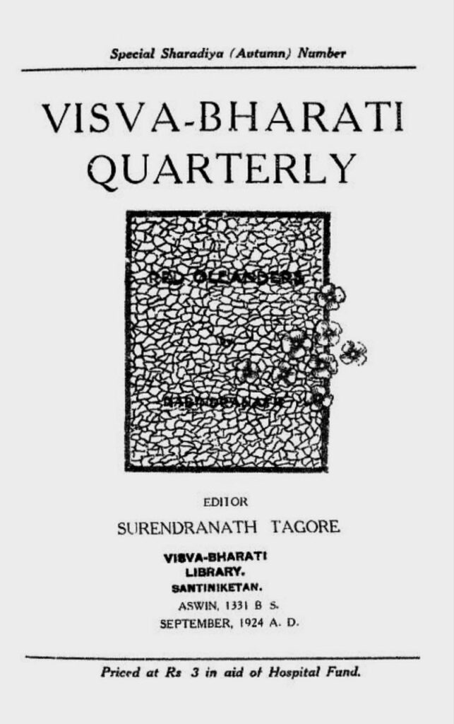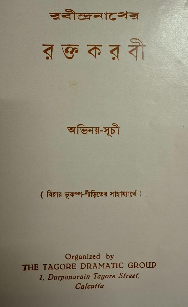 ‘IN AID OF THE EARTHQUAKE/ RELIEF FUND 6TH APRIL-7 P.M./ RABINDRA NATH’S/ RAKTAKARABI/ at/NATYA NIKETAN, Raja Raj Kissen Street in the immediate presence/of the poet/ Tickets available at/ CO-OPERATIF [sic] BOOK-DEPOT/Ashutosh Building, College Square, Calcutta. Entire Proceeds to go to the Earthquake/ Relief Fund.’