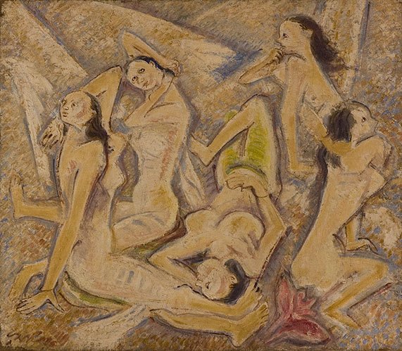 এগুলির পাশাপাশি আরও কিছু ছবি আছে, যেগুলির বিষয়বস্তু স্থানীয় পরিবেশ। যেমন ঝড়ের মধ্যে দাঁড়িয়ে থাকা গ্রাম, সান্ধ্য বাতাসের মধ্যে দিয়ে ছাগল টেনে নিয়ে যাওয়া একটি মেয়ে, খামারবাড়ির শ্রমরত আর বিশ্রামরত মজুর, ঘরামি, ফসলকাটা এবং এইরকম আরও কিছু। কিন্তু এই সাধারণ বিষয়বস্তুর প্রত্যেকটিতেই একটি প্রতীক বা মিথিক্যাল বিমূর্ততার মাত্রা যোজনা করেছেন তিনি। ‘ঝড়ের মধ্যে দাঁড়িয়ে থাকা গ্রাম’— এক গভীর বিমূর্ততার মধ্যে দিয়ে নিয়ে যেতে দেখি। যেখানে ঝলকে ওঠা আঁকাবাঁকা বিদ্যুৎরেখার ভিতর দিয়ে রাত্রি-ঘেরা বাড়িগুলির চাল আলোকিত হয়ে উঠতে দেখা যায়। মেয়েটির ছাগল টেনে আনার মধ্যে দিয়ে মূর্ত হয়ে ওঠে বীরাঙ্গনার ভাবভঙ্গি। ঘরামি বা বিল্ডার্স-এ দেখা যায়— নারী, পুরুষ, শিশু-সহ খুঁড়ে বার করা একটি কঙ্কাল। জন্ম, জীবন এবং মৃত্যু নিয়ে ঠিক যেন মধ্যযুগীয় প্রতীক এটি। এমনকী ‘ধান কাটা’ এবং ‘ধান ঝাড়া’র মধ্যেও একটি এপিক মাত্রা যোজনা করেছেন তিনি।