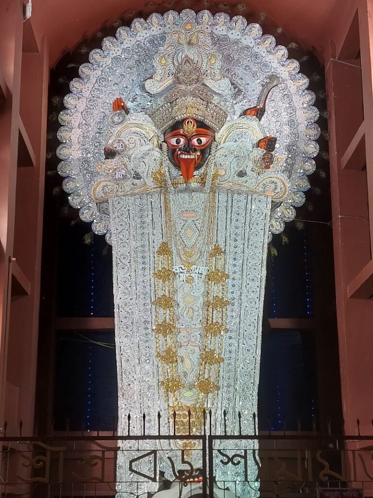 শহরের দক্ষিণে তেঘরিপাড়া এক প্রাচীন এলাকা। শ্যামাপুজোর আদি পীঠ। বড়, মেজ, সেজ, ছোট সব শ্যামাই সেখানে পুজো পান। নামেই মালুম যে এঁদের বয়স, বর্ণ, কৌলীন্য, সঙ্গতি আলাদা-আলাদা। আকারের কম-বেশি আছে। ‘জাগ্রত’ বলে ডাকসাইটে বড়শ্যামার পুজোয় উপচে পড়ে দর্শনার্থী। প্রতিমার গায়ে যে সোনার গহনা ঝোলে, তা তারাপীঠ-কালীঘাটের ঈর্ষার উদ্রেক করে। এবারেও করোনার জুজুকে কাঁচকলা দেখিয়ে যথাবিহিত পুজোআর্চা হল সকাল ন’টা থেকে। সারাদিন ধরে হাজার দেড়েক শাড়ির পাহাড় হল দীর্ঘাঙ্গী প্রতিমার সামনে। সন্ধেবেলায় একে-একে ৪২টা পাঁঠার বলি হল যূপকাষ্ঠে। শুধু তো নবদ্বীপের লোক নয়, সারা নদিয়া জেলা, লাগোয়া বর্ধমান, এমনকী ২৪ পরগনা, মেদিনীপুরের পুণ্যার্থীরা এসে জমিয়ে দিলেন উৎসব।