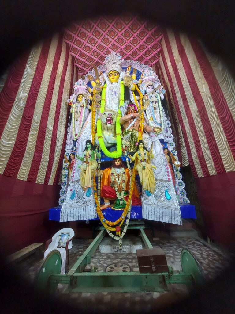 একটু দূরে আলোছায়া সিনেমার গলির মুখে কয়েতবেলতলায় ‘সর্বজনীন শ্রীশ্রী গঙ্গামাতা পূজা’। প্রতিমার সামনে যেতে দেখি, শিশুপুত্রকে কাঁধে চড়িয়ে দাঁড়িয়ে এক পিতা প্রতিমা চেনাচ্ছেন। ‘ওই দেখো, জোড়া মকরের ওপর মা গঙ্গা দাঁড়িয়ে আছেন। এক পাশে ব্রহ্মা, আরেক পাশে বিষ্ণু। আর ওই নীচে এদিকে জহ্নুমুনি, ওদিকে মহাদেব। আর ঘণ্টা হাতে যিনি পুজো করছেন তিনি ভগীরথ।’ শিশু শুনল। মন দিয়েই শুনল। তারপর শুধোল, ‘আর লায়ন কোথায় বাবা?’ মা শুনে হেসে কুটিপাটি। মাসির দরদ উথলে উঠল, ‘শিবের নিচে নন্দীকে দেখেছে তো, তাই বলছে!’ মনে-মনে ভাবি, মহিষমর্দিনী মূর্তিতে ছয়লাপ পথেঘাটে শিশুর মনে দাগ কেটে গেছে কেশর-ফোলানো সিংহের দাপট। আপাতত চোখে হারানোর দশা চলছে। দীনেশ স্মৃতি সঙ্ঘের এ-পুজোর শুরু ১৯০৭ সালে। চোখে হারানো আর চেনাশোনার সেই ট্র্যাডিশন সমানে চলেছে।