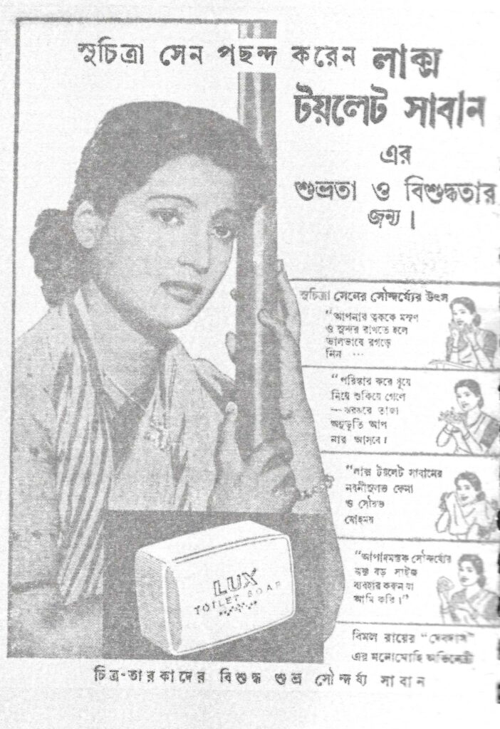 তবে সাবানের সঙ্গে সিনে-সুন্দরীদের সোহাগের সম্পর্ক স্থাপনের শুরুটা হয়েছিল লাক্স টয়লেট সাবান গায়ে মেখে। সময়কাল ১৯২৯, লাক্স সাবানের প্রথম তারকা-সুন্দরী লীলা চিতনিস। তখন লাক্স সাবানের দাম দু’আনা। যদিও লাক্সের পথ চলা তারও তিন দশক আগে। উইকিপিডিয়ার তথ্যানুসারে ১৮৯৯-এ, ইউনিলিভার নিয়ে আসে ‘সানলাইট প্ল্যাক’ নামে এক লন্ড্রি সোপ, ১৯২৫-এ তা রূপান্তরিত হয় ‘লাক্স টয়লেট সোপ’ নামে। তারপর সময়ের সঙ্গে-সঙ্গে তা হয়ে উঠে ‘চিত্রতারকাদের সৌন্দর্য সাবান’। দীর্ঘদিনের সেই লাক্স-চিত্রতারকার ভিড়ে, কে না ভিড়তে চেয়েছেন! টলি-বলির সেরা সুন্দরী নির্বাচন হয়েছে, লাক্সের বিজ্ঞাপনী-মুখের নিরিখে। ১৯২৯-এ লীলা চিতনিসকে দিয়ে যে এক বিজ্ঞাপন-ঘরানার শুরু, আজও আসন্ন শতবর্ষের মুখে তার জয়যাত্রা অব্যাহত। ১৯৫৫-তে মহানায়িকা সুচিত্রা সেন যে সাবানের ‘শুভ্রতা ও বিশুদ্ধতার জন্য’ প্রচারের মুখ হন, যে-সাবান মেখে কানন দেবী বলেন, ‘কমনীয় ত্বক, সহজেই পাওয়া যায়’। মীনাকুমারী যখন ‘পাকিজা’-খ্যাত অভিনেত্রী, তিনি তাঁর সৌন্দর্য ও ত্বক-লাবণ্যের যত্ন নেওয়ার গোপন উপায়স্বরূপ ‘সর্বদা বিশুদ্ধ শুভ্র লাক্স’ সাবান ব্যবহারের কথা বলেছেন। পরবর্তীতে অপূর্ব দেহ-লাবণ্যের অধিকারী মালা সিনহার অভিমত, ‘স্নানের সময় লাক্স সত্যিই আনন্দদায়ক’। এই আনন্দদায়ক অবগাহনে তৃপ্ত হয়েছেন মধুবালা, সায়রা বানু, আশা পারেখ। লাক্সের হয়ে ১৯৮৩ সালে মিস ইন্ডিয়া হেমা মালিনী লাক্সের বিজ্ঞাপনী-মডেল হন; তাঁর বিবৃতি ছিল, ‘আমি যা চাই, পেয়ে গেছি, থ্যাংকস লাক্স’। লাক্সের সঙ্গে স্নান করে সতেজ ও তরতাজা সুন্দরীর দলে আছেন রেখা, শ্রীদেবী, জিনাত আমন, জয়াপ্রদা। সপ্রতিভ বিদূষী-সুন্দরী অপর্ণা সেনের বক্তব্য, ‘নিজের ওপর আমার, নেই কোনো অধিকার’। এরপর এই অনধিকারের বিশ্লেষণে শেষমেশ বলা হচ্ছে, লাক্স ‘সবসময় আমার রঙরূপের পরিচর্যা করে’। অভিনেত্রী শোভা সেন বলছেন, লাক্স সরের মত মোলায়েম, সুগন্ধী এই ফেনা আপনার ত্বকের যত্ন নেয়। ‘নতুন ফসল’ ছায়াছবির নায়িকা সুপ্রিয়া চৌধুরীর বিজ্ঞাপন-বক্তব্য, ‘চেহারায় আমার রূপের ছোঁয়া লেগেছে লাক্সের কোমল পরশ পেয়েছে বলেইতো’। সমকালীন অভিনেত্রী সাবিত্রীর অভিমতে, ‘আমার ত্বককে এটি মোলায়েম আর মসৃণ রাখে’। লাক্স-সুন্দরী সিরিজের অন্যতমা ওয়াহিদা রহমান জানিয়েছেন, ‘সৌন্দর্য্যের গোপন কথা হলো ত্বকের কুসুমসম কোমলতা’, যা দিতে পারে একমাত্র লাক্স সাবান। সময়ের সরণি বেয়ে সব চিত্রতারকা সুন্দরীই লাক্স মেখে স্নান করেছেন। লাক্স-সুন্দরী হয়েছেন মাধুরী দীক্ষিত, জুহি চাওলা, করিশমা কাপুর, রানি মুখার্জি, করিনা কাপুর, ঐশ্বর্যা, আমিশা, ক্যাটরিনা। এই সুদীর্ঘ সুন্দরী-সারিতে কতিপয় সুন্দরের মুখও নজর কেড়েছে। নি