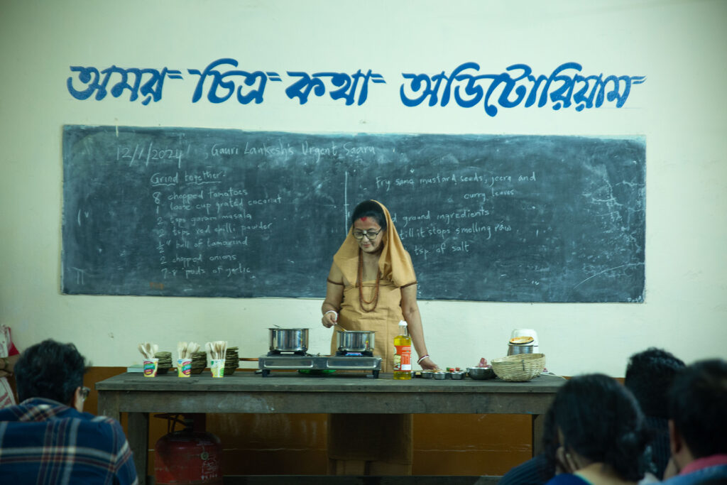ভারতমাতার হাতে পতাকাটা আমার সংযোজন (হাসি)। মূলগতভাবে এটা সমালোচনা। আসলে বিষয়টা যথেষ্ট জটিল। এটা ভারতমাতার ইমেজেরও সমালোচনা। একটা ধুন্ধুমার সেটে এক পৌরাণিক চরিত্র, যদিও ভারতমাতা মোটেই পৌরাণিক চরিত্র নয়। যাই হোক, সেই কবি (মমতা) এবং সে একজন স্কলারও, সে ভারতমাতাকে নিয়ে এসে স্থাপন করে। পরে তাকে নিয়ে যাওয়া হয়। অন্যদিকে মমতা প্রাণচঞ্চল, আধুনিক, নানা ভাবে, নানা ভঙ্গিমায় কথা বলে। সে ভারতমাতাকে নিয়ে কথা বলতে শুরু করে জিজ্ঞাসা করে ভারতমাতা কেন রানির মতো (যদিও আমি মনে করি না এই ইমেজ সবসময়ে রানির মতোই)। সেই সঙ্গে দেশে মহিলাদের অবস্থান, পরিস্থিতি ইত্যাদি। তারপর সে কন্নড় ভাষার প্রথম মহিলা জাতীয়তাবাদী কবি নাঞ্জাগুড় তিরুমালাম্বা সম্পর্কে বলে। তিরুমালাম্বা আলাদা কর্ণাটক রাজ্য (স্বাধীনতার পর), ভারতমাতা, কন্নড়মাতা আন্দোলন ইত্যাদি বিষয়ে কবিতা লিখেছেন। উনি বালবিধবা হওয়ায় নিঃসন্তান ছিলেন; স্কুলে পড়াতেন, দু-তিনটে পত্রিকার সম্পাদক, গোয়েন্দা গল্প লিখতেন। খুবই জনপ্রিয় ছিলেন। পরে কী হল, পাঁচের দশকে এক পুরুষ লেখক প্রকাশ্যে তাঁর লেখাকে অপমানজনকভাবে নস্যাৎ করেন। চরম অপমানিত হয়ে তিনি অন্তরালে চলে যান। বহুদিন তাঁর খোঁজ মেলেনি। ধরে নেওয়া হয়েছিল, তিনি মৃত। আটের দশকে কয়েকজন কন্নড় নারীবাদী রীতিমতো অনুসন্ধান করে যখন তাঁকে পুনরুদ্ধার করে, তখন তাঁর বয়স নব্বইয়ের কোঠায়। এই ঘটনার কথা… দেশে মহিলাদের অবস্থার কথা… তাছাড়া স্বাধীনতা আন্দোলনের সময়ে নেহেরু প্রশ্ন তুলেছিলেন, ভারত তো দরিদ্র, তার প্রতীক এত সম্পদশালী, বিত্তবান হয় কী করে! পারফরম্যান্সটা এভাবে শেষ হয়। তো দেখা যাচ্ছে যে, এটা আসলে একটা আদর্শ। সবাই তাঁর মতো হবে, তাঁর মতো সাজবে, চলবে। কিন্তু আমার ভারতমাতা বসে-বসে নির্বিকারভাবে উল বোনে।