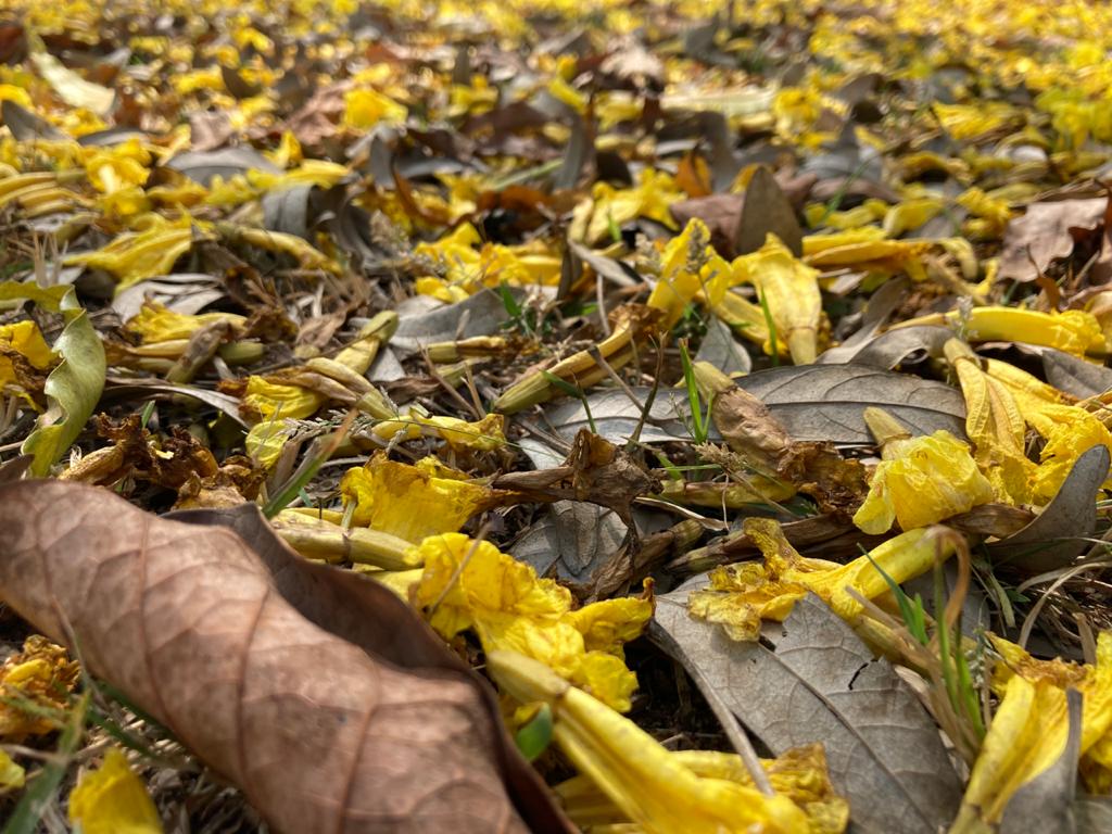 আর আছে হলুদ ফুল। যেমন মায়াবী গাছে, তেমনই স্নিগ্ধ ঝরে ঝরে ঘন হওয়া ফুলের গালিচায়। বসন্তে হলুদ ফুলে ভরে থাকা একটা গাছকে আমরা অনেকে প্রায়ই ভুল নামে ডেকেছি। এখনও ডাকছি। ফাগুন-বউ নয়, ফুলটা কিন্তু ট্যাবেবুইয়া। চলতি নাম বসন্তবাহার। এটাই বেশি দেখা যায় শান্তিনিকেতনের প্রায় সর্বত্র। পলাশ ঝরে না অত বেশি, যত বেশি এই ফুল ঝরে যায়। ফাগুন-বউও আছে। তুলনায় অনেক কম, পাপড়ি কিছুটা পুরু। ঠিক যেন হলুদ শিমুল ফুল। কিছু রক্তিম ফুল বসন্ত মাত করে দেয়। রক্তরাগ, সুপ্তি, গিরিকমল, স্প্যাথোডিয়া, পাখিফুল, পালতে মাদার, অশোক আর ঘোর লেগে যাওয়া পারিজাত। অপরূপা লাল ফুলগুলো প্রায় সৌরভহীন। তাহলে বসন্ত কি রেখে যায় না সৌরভের স্মৃতি? পেল্লায় গাছগুলোর নীচে স্তূপীকৃত পড়ে থাকে মুচকুন্দ। তবে তার খুব কাছে না গেলে আশ্চর্য গন্ধটা পাওয়া ভার। নিঝুম সন্ধ্যায় কুড়িয়ে আনা মুচকুন্দ, বন্ধ দু’চোখের পল্লবের উপর রাখলে, মনে হয় যেন হারিয়ে যাওয়া ভালবাসার ফিরে আসার স্পর্শ, শরীরে যার মায়ার সৌরভ। তবে বসন্তের শান্তিনিকেতনে লতানো ফুলের রানি যেন নীলমণিলতা।