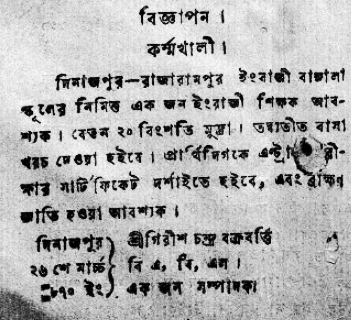 ‘দিনাজপুর— রাজারামপুর ইংরাজী বাঙ্গালা স্কূলের নিমিত্ত একজন ইংরাজী শিক্ষক আবশ্যক। বেতন ২০ বিংশতি মুদ্রা। তদ্ব্যতীত বাসা খরচ দেওয়া হইবে। প্রার্থিদিগকে এন্ট্রান্স পরীক্ষার সার্টিফিকেট দর্শাইতে হইবে, এবং ব্রাহ্মণ জাতি হওয়া আবশ্যক।’ (‘অমৃতবাজার পত্রিকা’, ২৬ মার্চ, ১৮৭০)