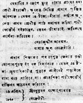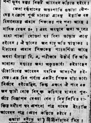 ‘প্রধান শিক্ষকের পদ রংপুর জেলার কুণ্ডী গোপালপূরস্থ ইং বঙ্গ বিদ্যালয়ে। বেতন ৩৫ টাকা। ভূম্যাধিকারীর পুত্রকে প্রাইবেট পড়াইলে বাসা খরচ লাগিবে না। প্রবেশিকা পরীক্ষোত্তীর্ণ ব্যক্তিগন আবেদন করিবেন।’