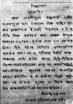 ‘জেলা মেদিনীপুরের অন্তঃগত – এষ্টেন মছলন্দপুরের মধ্যে মহিষাদল রাজ বাটিতে রাজকুমার দিগকে ইংরাজী পড়াইবার ও রীতিনীতি শিক্ষা করাইবার জন্য একজন উপযুক্ত শিক্ষকের প্রয়োজন। মাসিক বেতন ১০০ শত টাকা। যিনি সাবেক সিনিয়র এসকলারসিপ হোলডার অথবা এম.এ পরীক্ষায় উত্তীর্ণ অথচ শিক্ষকতা কার্য্য করিয়া তাহার রীতিনীতিতে বিশেষ পারগ হইয়াছেন, এমত সৎ স্বভাব বিশিষ্ট কর্ম্মপ্রার্থিগণের আবেদন সমধিক আদরণীয় হইবে। কর্ম্মপ্রার্থিগণ স্ব  স্ব প্রশংসা পত্রের অনুলিপি সহ ডিসেম্বর মাসের ২০ দিনের মধ্যে নিম্ন স্বাক্ষরকারীর নিকট আবেদন করিবেন।