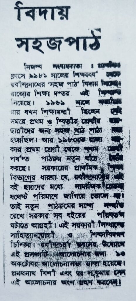 যে-গ্রন্থের জন্য পরবর্তীকালের বিশিষ্ট কবি বুদ্ধদেব বসু ‘বাঙালি শিশুর ভাগ্যকে জগতের ঈর্ষাযোগ্য’ বলে মনে করছেন, সেই ‘সহজ পাঠ’ শিশু-শিক্ষার্থীদের জন্য কতখানি উপযুক্ত, সেই নিয়েই এক বিতর্ক বেধেছিল গত শতকের আটের দশকে। ১৯৮০-র শিক্ষাবর্ষের শুরুতেই তৎকালীন প্রাথমিক শিক্ষা দপ্তর থেকে সিদ্ধান্ত নেওয়া হয়— নতুন শিক্ষাবর্ষে অর্থাৎ জানুয়ারি ১৯৮১ থেকে সরকারি পরিকল্পনামতো, ‘সহজ পাঠ’ প্রথম ভাগ ও দ্বিতীয় ভাগের বিকল্প গ্রন্থ পড়ানো হবে যথাক্রমে সরকার অনুমোদিত প্রাথমিক বিদ্যালয়ের প্রথম শ্রেণি ও দ্বিতীয় শ্রেণিতে। প্রসঙ্গত উল্লেখ্য, ১৯৬৯ সালে যুক্তফ্রন্ট সরকারের শিক্ষামন্ত্রী সত্যপ্রিয় রায়ের তত্ত্বাবধানে, ‘সহজ পাঠ’ প্রথম ভাগ ও দ্বিতীয় ভাগ সরকারি প্রাথমিক বিদ্যালয়ের প্রথম শ্রেণি ও দ্বিতীয় শ্রেণিতে পাঠ্য করা হয় এবং বিশ্বভারতীর অনুমোদন নিয়ে সরকারি অর্থানুকূল্যে তা বিনামূল্যে বিতরণ করা হয়। অন্যদিকে, বিশ্বভারতীতে ‘সহজ পাঠ’ প্রথম ও দ্বিতীয় ভাগ প্রথম ও দ্বিতীয় শ্রেণিতে পাঠ্য, এবং ক্ষিতীশ রায় সম্পাদিত ‘সহজ পাঠ’ সংকলনগ্রন্থের তৃতীয় ও চতুর্থ ভাগ পাঠ্য যথাক্রমে তৃতীয় ও চতুর্থ শ্রেণিতে।