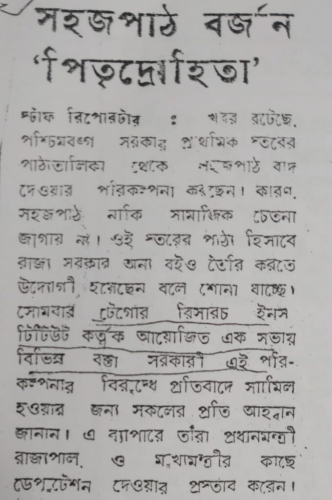 এবার আসা যাক ১৯৮০ সালে, অর্থাৎ ‘সহজ পাঠ’ প্রকাশনার সুবর্ণ জয়ন্তীতে সরকারি দৃষ্টিতে কী এমন অসঙ্গতি চোখে পড়ল, যাতে শিশু-শিক্ষার্থীদের পাঠ্যতালিকা থেকে ‘সহজ পাঠ’কে বাদ দিয়ে বিকল্প গ্রন্থের পরিকল্পনা করতে হল। সংবাদমাধ্যমে প্রকাশিত (‘যুগান্তর’, ১০ অক্টোবর ১৯৮০) সরকারের প্রাথমিক শিক্ষা বিভাগের ধারণা, রবীন্দ্রনাথের ‘সহজ পাঠ’ ছাত্রদের মধ্যে যথেষ্ট পরিমাণে সামাজিক চেতনা জাগাতে অক্ষম। তাই নতুন পাঠক্রমের সঙ্গে সংগতি রেখে সরকার সব বইয়ের পরিবর্তন ঘটাতে আগ্রহী। তৎকালীন বামফ্রন্ট সরকারের এহেন সিদ্ধান্তে, রীতিমতো শোরগোল পড়ে গেল। শিক্ষিত সাহিত্যানুরাগীরা ক্ষুব্ধ হলেন, রবীন্দ্রপ্রেমীরা সরকারি সিদ্ধান্তের ঘোরতর বিরোধিতায় নামলেন। এই বিষয়ে প্রথম থেকে শেষ অবধি সরব হয়েছিল টেগোর রিসার্চ ইনস্টিটিউট। শান্তিনিকেতনের বিশিষ্টজনেরা নিন্দেমন্দ করলেন। শিল্পীরা সমাবেশ করে বিক্ষোভ দেখালেন। সর্বোপরি সেই সময়ে বামফ্রন্ট সরকারের বিরোধীপক্ষে থাকা কংগ্রেস রাজনৈতিক ভাবে এর লাগাতার বিরোধিতা করতে শুরু করে। অন্যদিকে সরকারি সিদ্ধান্তের পক্ষে তৎকালীন বামপন্থী বুদ্ধিজীবীরা সওয়াল করেছিলেন এবং সিদ্ধান্তের স্বপক্ষে অনড় ছিলেন প্রাথমিক শিক্ষা পর্ষদের চেয়ারম্যান অনিলা দেবী, শিক্ষামন্ত্রী পার্থ দে, এমনকী স্বয়ং মুখ্যমন্ত্রী জ্যোতি বসু মহাশয়। সেই সময়কালে প্রকাশিত দৈনিক সংবাদপত্রও এই বিষয়ে দ্বিধাবিভক্ত হয়ে পড়ে। সরকারি সিদ্ধান্তের প্রবল বিরোধিতায় ‘আনন্দবাজার পত্রিকা’র অবস্থান ছিল স্পষ্ট। ‘যুগান্তর’ দু’পক্ষের মতামত প্রকাশ করেছে, তবে সম্পাদকীয় স্তম্ভে ‘সহজ পাঠ’-এর পক্ষেই রায় ছিল। অন্যদিকে সরকারি সিদ্ধান্তকে সমর্থন জুগিয়েছিল ‘দৈনিক বসুমতী’ এবং ‘সত্যযুগ’। এ ছাড়াও অন্যান্য পত্রপত্রিকাতেও, ১৯৮০ সালের অক্টোবর, নভেম্বর এবং ডিসেম্বর মাসে, ‘সহজ পাঠ’ বিষয়ে চাপানউতোর ছিল মুখ্য আলোচ্য বিষয়। সব কিছুর মাঝে দাঁড়িয়ে সাধারণ মানুষের প্রতিক্রিয়াও ছিল চোখে পড়ার মতো। ‘যুগান্তর’ পত্রিকার ‘পাঠকের মতামত’, ‘আনন্দবাজার পত্রিকা’র ‘সম্পাদক সমীপেষু’, ‘দৈনিক বসুমতী’তে ‘মতামত পাঠকের’ এবং ‘সত্যযুগ’ পত্রিকার ‘সম্পাদকের কাছে চিঠি’তে অসংখ্য মানুষ তাঁদের মতামত রেখেছেন। জনতার বিমিশ্র প্রতিক্রিয়ায় যদিও সহজেই ধরা পড়েছিল সরকারি সিদ্ধান্তের বিপরীতে সিংহভাগের অবস্থান। সবদিক বিচার করে, সরকারের তরফে নভেম্বরের গোড়ায় শিক্ষামন্ত্রী জানান যে, ‘সহজ পাঠ’ গ্রন্থের বিকল্প গ্রন্থ ছাপা আপাতত স্থগিত। যদিও তার কিছুদিন পরেই সিদ্ধান্ত বদলে সংবাদমাধ্যমে জানানো হয় সরকারের পূর্ব পরিকল্পনা মতো ‘সহজ পাঠ’-এর বিকল্প গ্রন্থ আগামী শিক্ষাবর্ষে শিশু-শিক্ষার্থীদে