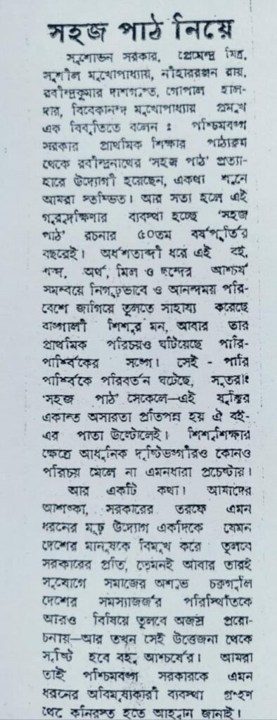বিতর্কের প্রেক্ষাপটে সুকুমার সেন মহাশয় লিখছেন (‘রবীন্দ্র ভাবনা’, নভেম্বর-ডিসেম্বর ১৯৮০), ‘শুনতে পাচ্ছি যে পশ্চিমবঙ্গ গভরমেন্টের মনস্থির হয়েছে যে প্রাথমিক শিক্ষার পাঠ্য তালিকা থেকে রবীন্দ্রনাথের ‘সহজ পাঠ’ বাদ দেওয়া আবশ্যক হয়ে পড়েছে। এ মতলবের কারণ কী তা ঠিকমত শুনিনি, বুঝতেও পারছি না। কানে গেছে যে বইটি নাকি সমাজ চেতনার উদ্বোধনে কোন কাজের নয়, হয়তো অকাজের। কিন্তু ক’বছরের শিশুদের পাঠ্য ‘সহজ পাঠ’? চার থেকে পাঁচ-ছয়, বড়ো জোর সাত। এ বয়সের শিশুর কি সমাজ চেতনা হওয়া স্বাভাবিক ব্যাপার? না হলে কি তা বাঞ্ছনীয়? না, স্বাভাবিক ব্যাপার নয়, বাঞ্ছনীয়ও নয়?’ বিশিষ্ট প্রাবন্ধিক, ভাষাবিদ সুকুমার সেনের বক্তব্যটি সমর্থনযোগ্য। পাঁচ বছর বয়সি ‘সহজ পাঠ’ পড়ুয়াদের মন এবং মাথা তো সহজ, সরল, অনাবিল— সেখানে সমাজচেতনা, শ্রেণিবৈষম্যের স্থান কতটুকু! প্রসঙ্গত, বিকল্প গ্রন্থের পক্ষে তৎকালীন রাজ্য সরকারের প্রাথমিক ও মাধ্যমিক শিক্ষাদপ্তরের মন্ত্রী পার্থ দে মহাশয়ের বক্তব্য— ‘নতুন পাঠক্রম সাধারণ মানুষকে তো বটেই এমনকি চাকর, ধোপা ও কৃষকদেরও আকৃষ্ট করবে তাদের সন্তানদের শিক্ষাদানের ব্যাপারে।’ (‘যুগান্তর’, ২০ অক্টোবর ১৯৮০) তিনি বলছেন, ‘এখন মেহনতি জনগণের পরিবারের ছেলে মেয়েরা স্কুলে আসছে। ধোপা বা নাপিতদের সম্পর্কে কোন হেয় মনোভাব পাঠ্য পুস্তকে থাকলে তাদের ছেলেমেয়েদের মনেও বিরূপ প্রতিক্রিয়া হতে পারে। পাঠ্যপুস্তকে এমন কিছু কথা থাকা উচিত নয় যাতে কোন ছাত্র মনে করতে পারে যে তার বাবা ছোট কাজ করেন।’ (‘আনন্দবাজার পত্রিকা’, ২২ অক্টোবর ১৯৮০)— শিক্ষামন্ত্রী মহাশয়ের বক্তব্যটি স্পষ্ট। কিন্তু প্রশ্ন, ‘সহজ পাঠ’ গ্রন্থে চাষি, ধোপা, চাকর, মালি, দাসী, দারোয়ান, অন্ধ ভিক্ষুক সব মানুষই আছেন, কিন্তু তাদেরকে ‘হেয়’ করে কোনও অবজ্ঞা বা অসম্মানসূচক কোনও কথা তো নেই! সব শ্রেণির মানুষ, চারপাশের পশুপাখি, দুই বাংলার নদী-নৌকা, গ্রাম-গঞ্জ, হাট-ঘাট, চাষবাস নিয়ে ‘সহজ পাঠ’ এক অখণ্ড বাংলার খণ্ড-খণ্ড রূপচিত্রের সমাহার বলেই তো মনে হয়। সেখানে শ্রেণিবৈষম্য, খাদ্যবৈষম্যের সন্ধান নিতান্তই ছিদ্রান্বেষীর পরিচায়ক। আর ওই উহ্য থাকা বিকল্প গ্রন্থ সম্পর্কে, তৎকালীন সিলেবাস কমিটির চেয়ারম্যান, তথা বিশ্বভারতী বিনয় ভবনের অধ্যাপক হিমাংশু মজুমদার মহাশয়ের উপলব্ধি (সূত্র: ‘সপ্তপর্ণী’, বিশ্বভারতী ছাত্র সম্মিলনীর মুখপত্র, সম্পাদক: অতনু শাসমল)— যেসব পড়ুয়া দারিদ্র্যক্লিষ্ট, সমস্যাজর্জর পরিবার থেকে আসে, তাদের বাড়িতে সহজ পাঠের ভাষায় কথা বলে এমন বাবা, মা, ভাইবোন নেই এবং অনুরূপ সাংস্কৃতিক পরিমণ্ডল নেই। তাই তাদের কাছে, ‘থাকে ওরা কান পেতে/লুকানো ঘরের কোণে।/ডাক পাড়ে বাতাসেতে,/কী করে সে ওরা শোনে!’— এই ‘ওরা’ তত স্