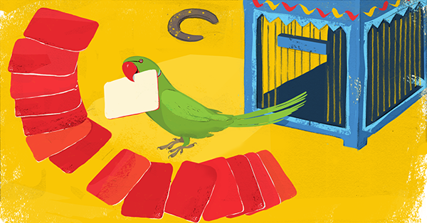 খাঁচায় পোষা টিয়াপাখি কয়েক মিনিটের মধ্যেই ভাগ্যের হাল-হকিকত জানিয়ে দিচ্ছে— তাও মাত্র কুড়ি কি তিরিশ টাকায়! কলকাতায় ইদানীং এই দৃশ্য কিছুটা কমে এসেছে বটে, কিন্তু এখনও ভারতীয় জাদুঘর, হাওড়া ব্রিজ, জোড়া গির্জা কিংবা মল্লিকবাজারের ফুটপাতে এরকম অদ্ভুত মুহূর্তের সাক্ষী থাকতে পারা যায়। কীভাবে হয় এই ভাগ্যপরীক্ষা? পাখির খাঁচার একপাশে সার দিয়ে সাজানো থাকে একাধিক খাম, যার যে কোনও একটার ভেতরেই রয়েছে নিজের ভাগ্যের খবর। এরপর নাম-পদবি সব টিয়ার কাছে বলা হলে সে বাইরে এসে শুধু একটা খাম তুলে, আবার ছোলা খেয়ে খাঁচায় ঢুকে যাবে। ব্যস, ওটুকুই। পরের কাজ টিয়ার সঙ্গে যিনি থাকেন, তাঁর। তিনি এবারে ওই খামের ভিতরের চিরকুট (হিন্দি ও ইংরেজি ভাষায় লেখা) পড়ে পড়ে  ভাগ্যের কথা জানাতে থাকবেন, আর কোনও বাধা থাকলে তা পেরোবার পথও বলে দেবেন! কিন্তু মজার কথা হচ্ছে এই, প্রতিটা ভাগ্যনির্ণায়ক চিরকুটেই জীবনের বাধার কথা বাঁধাধরা।