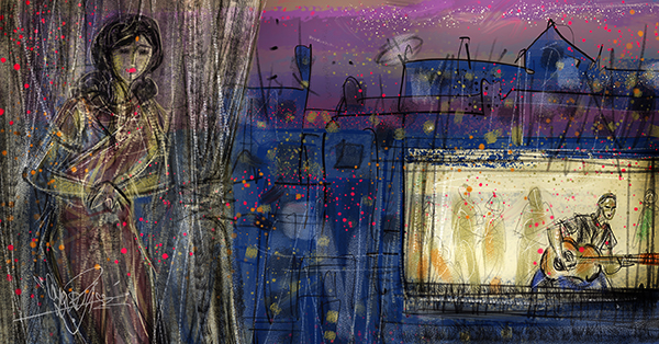 এত বছর পর মশারির মধ্যে শোওয়ার জন্য ঘুম আসতে দেরি হয়। একটু ঝিম এসে গিয়েছিল। হঠাৎ ঘুম ভাঙল হাসির রোলে। মোবাইলে দেখল রাত পৌনে দুটো। কথাবার্তার মাঝে কেউ একজন গিটারের স্ট্রিং সেট করছে। এক ঝটকায় মশারির বাইরে এল রায়া। জানলার পর্দাটা অল্প সরিয়ে নীচে তাকাল। সব কিছু ঘোলাটে হয়ে গিয়ে ফোকাসে এল একজন ছিপছিপে, লম্বা পুরুষ! এক লহমায় কতগুলো বছরের ফ্ল্যাশব্যাক— চোখে তার এখন চশমা, চুল বেশ কিছুটা পাতলা হয়ে গেছে, ট্র্যাক প্যান্ট আর টি-শার্ট। হাতে গিটার। কোরাসে, ‘ছেঁড়া ঘুড়ি, রঙিন বল/ এইটুকু সম্বল…।’