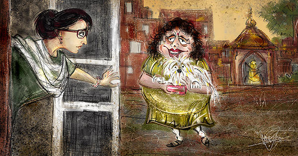 মাছগুলো ভাজা সারা। শেষে মুড়োদুটো তেল ছেঁকে তুলছি, এমন সময় বেলটা বাজল। মনটা তখনও মুড়ির ঘণ্ট আর মাছের মাথা দিয়ে লাউ-এর মাঝখানে পেন্ডুলামের মতো দুলছে। দরজা খোলার আগে দেখে নিলাম, ফুটোর ওপাশে দাঁড়িয়ে আছেন একজন ছোটখাট চেহারার গোলগাল বয়স্কা সুন্দরী। খুলতেই ফুশিয়া-লাল লিপস্টিক ঘেরা একগাল হাসি।
